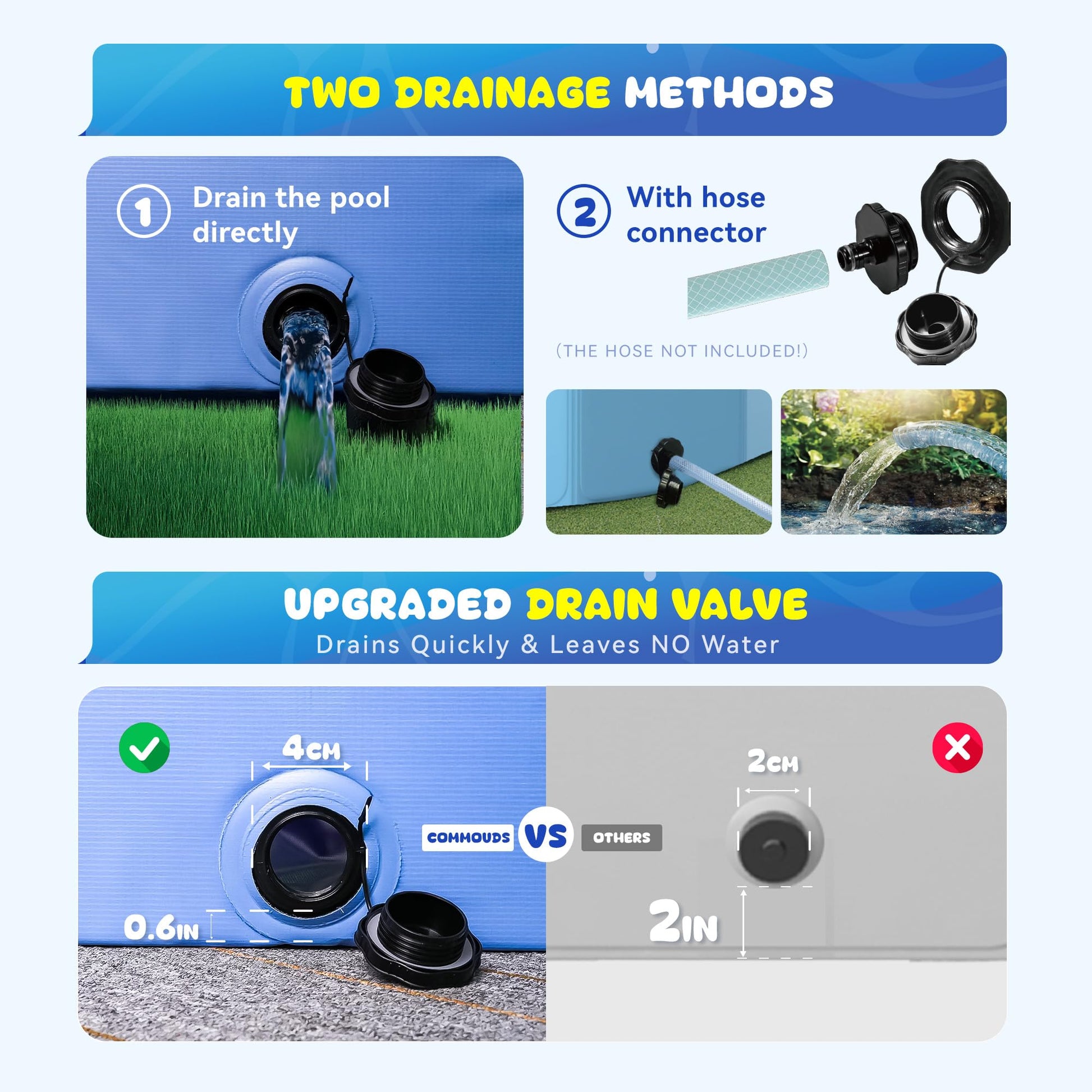 • Quick Drainage System: Our kiddie pool is designed for quick and efficient water release, featuring a drain valve just 0.2 inches from the bottom—lower than most pools—for faster drainage. The large 0.8-inch valve ensures minimal water residue. Additionally, we include a hose adapter so you can easily redirect the water and avoid backyard flooding