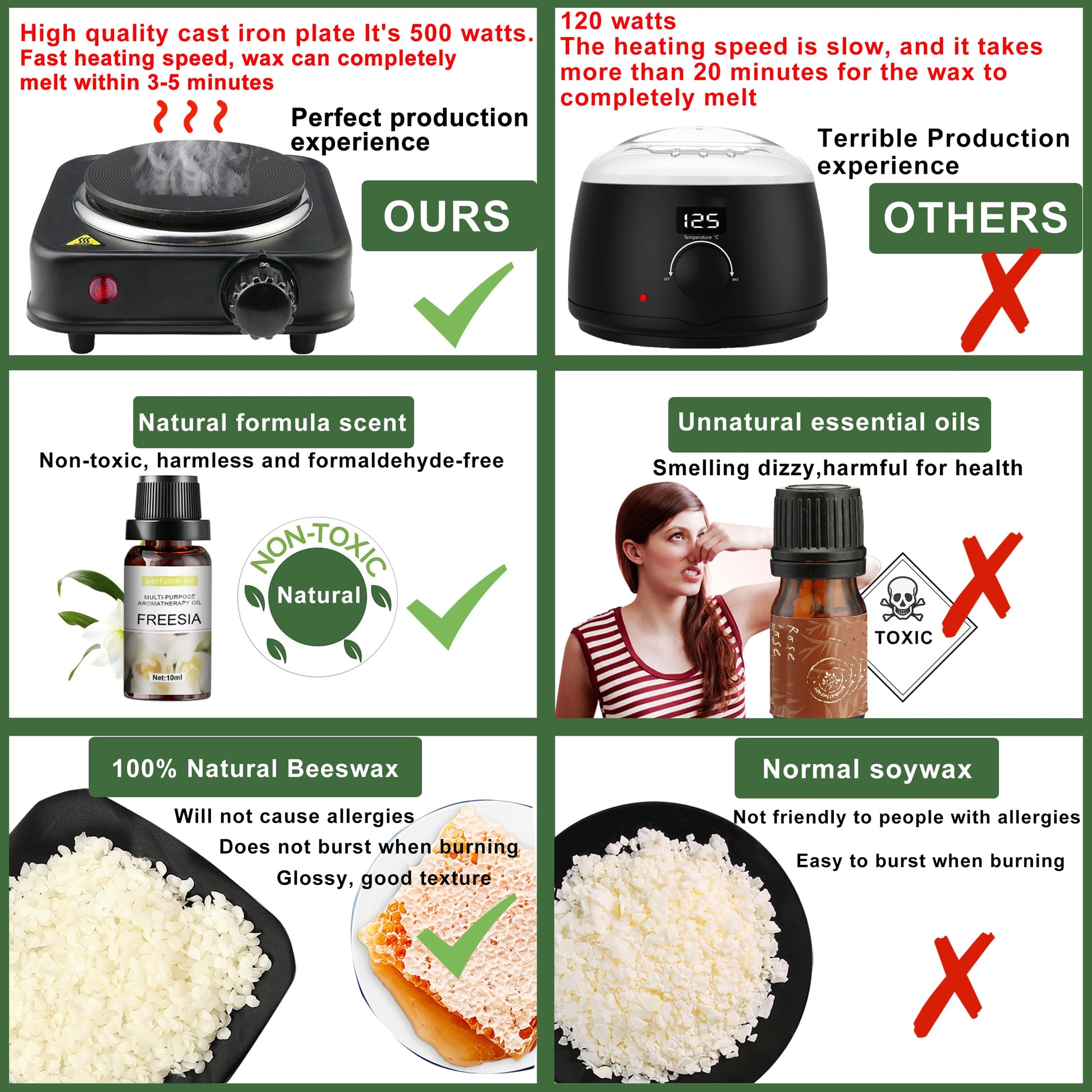 • 🎁Advanced Wax Material: Our candle making kit is made of 100% natural wax, the candle will not be easily deformed, cracked or melted, it can burn cleanly for a long time and effectively release the smell. No need to worry about the unhealthy chemicals found in traditional paraffin wax, we only use plant-based additives that naturally exist in the environment.