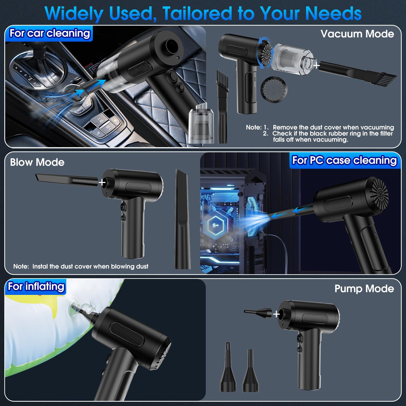 • 【Compressed Air Duster and Vacuum, Pump】Not only a compressed air duster, but also a handheld car vacuum for keyboard or cars, frames that is compact, lightweight and easy to use. Freely switch to compressed air duster or car vacuum cleaner mode according to your needs, easily removes dirt, debris, dust, pet hair, and deeply embedded dirt, also blow up swimming rings or blowing BBQ charcoal etc.