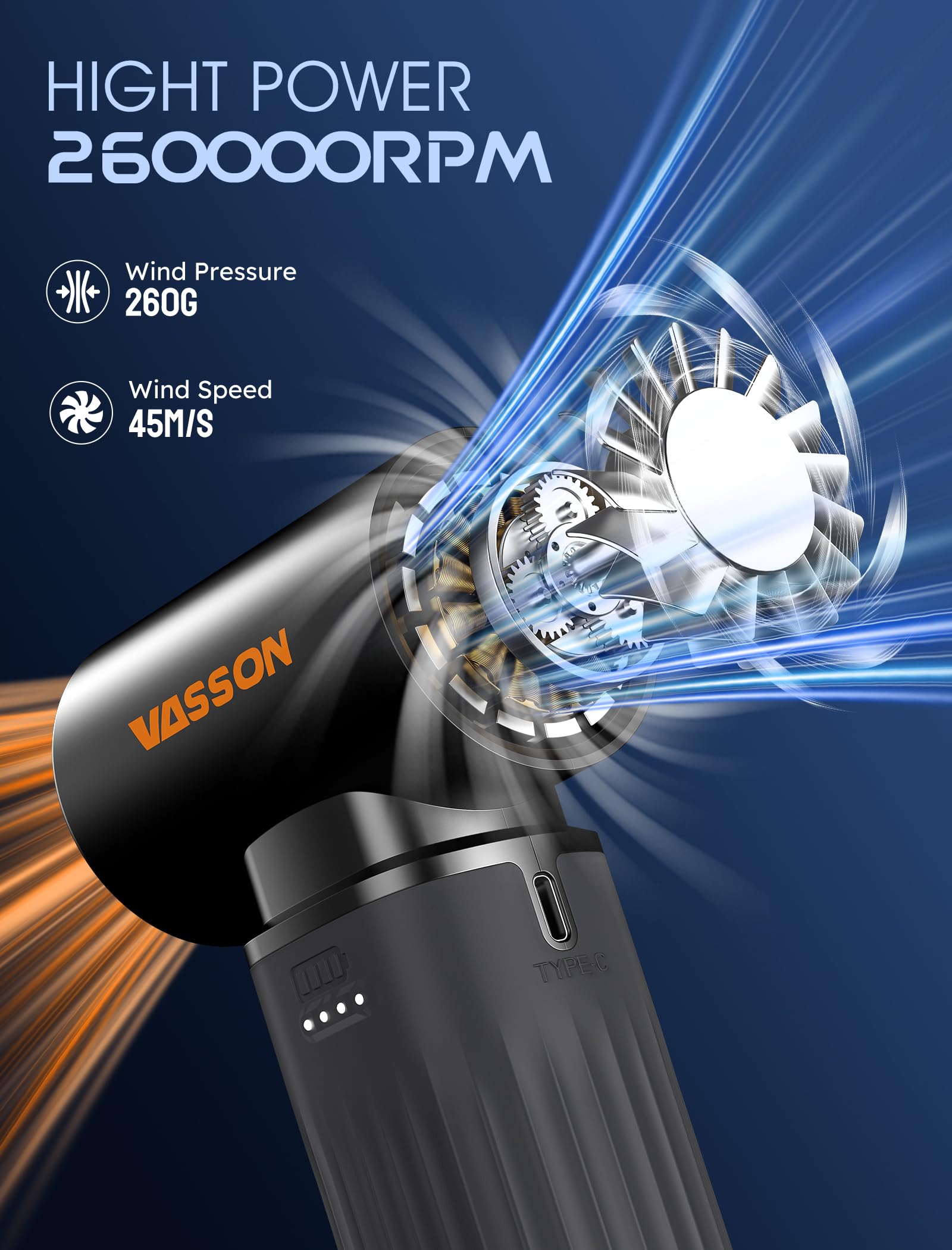 • Powerful Brushless Motor: This compressed air duster delivers speeds up to 260,000 RPM, producing 45 m/s maximum wind speed and 260 g strong pressure. The air blower quickly removes dust and debris, and with 3 adjustable speed settings, it easily adapts to different cleaning needs.