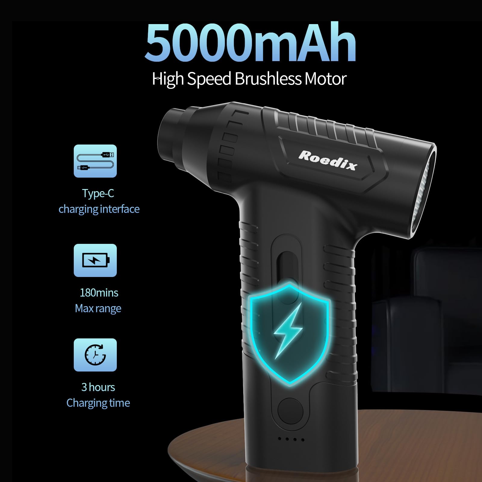 • 【Powerful Battery Life, Adjustable Air Speed】 This rechargeable air duster has strong wind speed and can be adjusted by sliding the button, an air duster meets all your needs, efficient and convenient, built-in large-capacity battery, can work continuously for 180 minutes(Low gear), comes with a type-C charging cable, this pc air duster can be fully charged within 3.5 hours. No canned air.