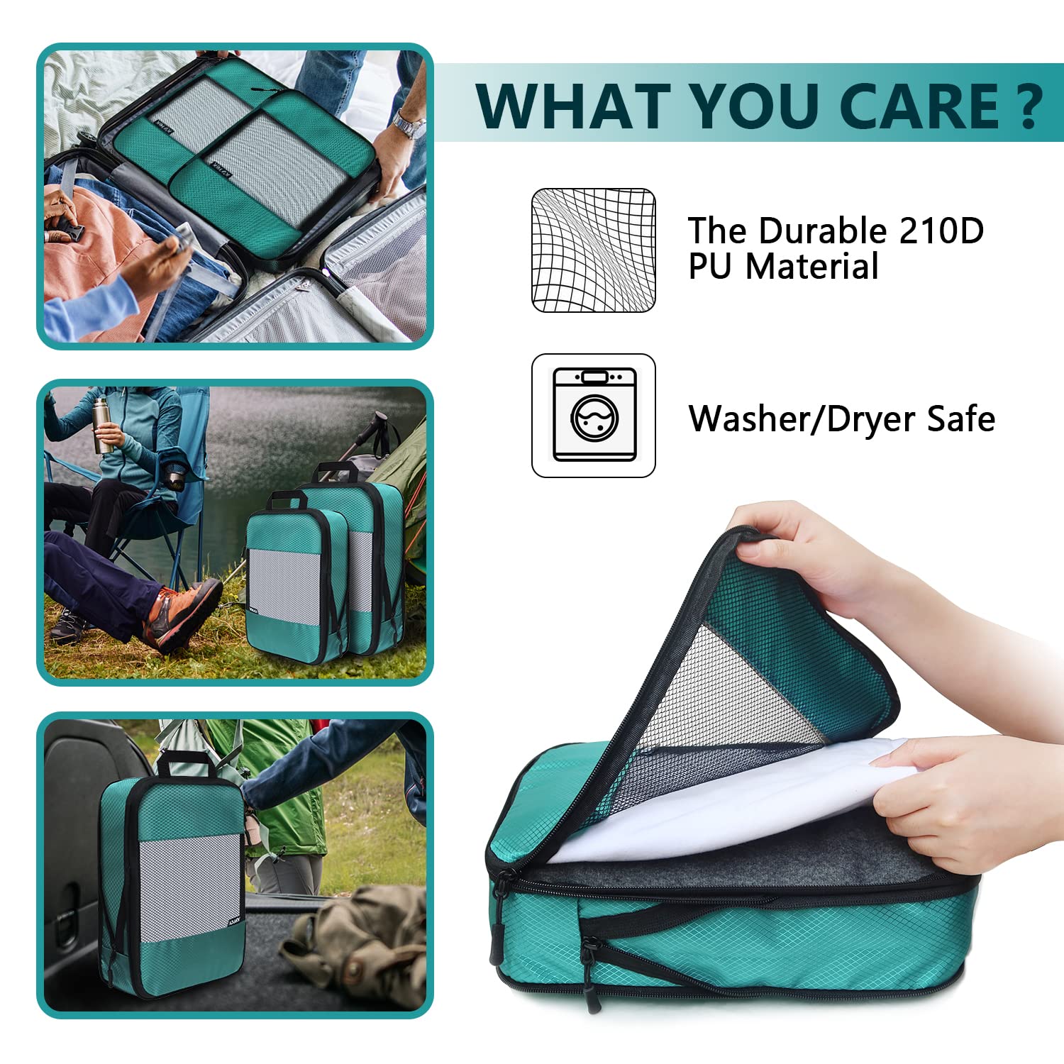 The durable double-zipper compression system of the packing cubes will help you compress clothes easily, saving up to 60% of space. You only need to: 1 Fold or roll up your clothes, flatten, and stack them neatly. 2 Put the organized clothes in the packing box and zip it up. 3 When compressing the packing cube