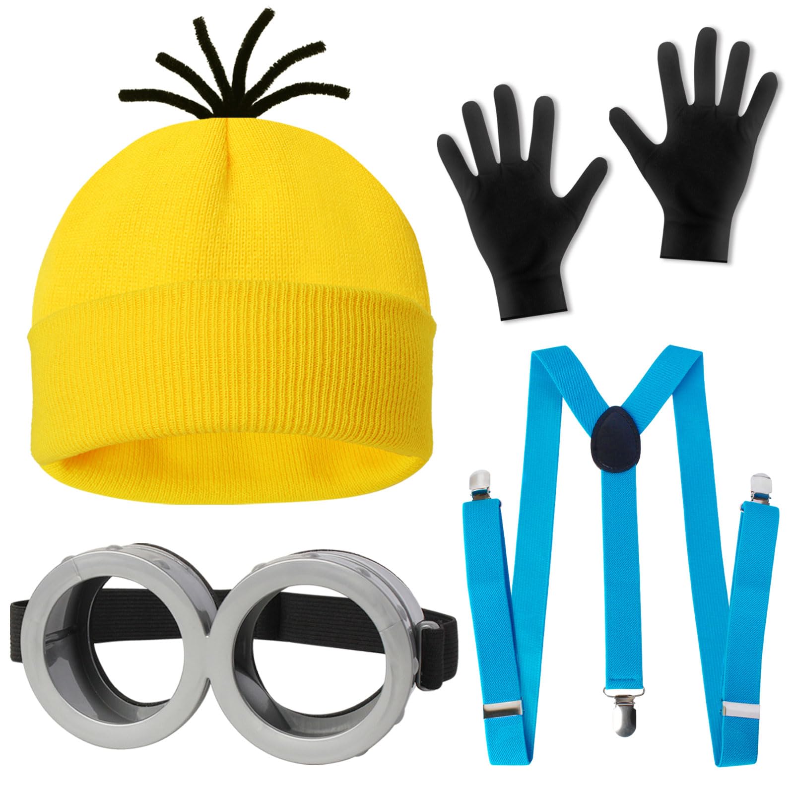 CONGRU 4 Pcs Halloween Costume Accessories Adults-Yellow Beanie Hat/Goggles/Gloves/Suspenders for Halloween Dress Up