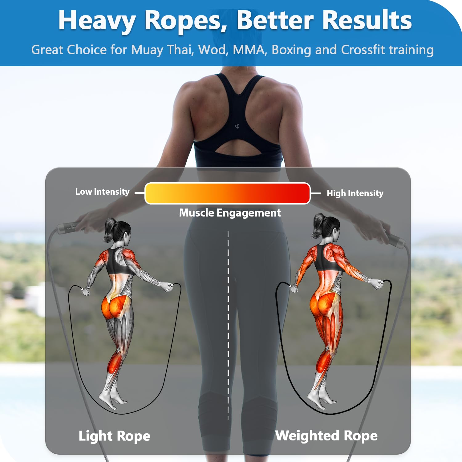 • 【Heavy Ropes, Better Results】 Each rope weights about 0.85LB with handles. Weighted Jump Rope features built-in high-quality ball bearings to ensure smooth, tangle-free motion. Using a weighted jump rope effectively enhances strength and accelerates full-body calorie burning, with 5 minutes of use equivalent to 15 minutes with a regular rope. Challenge yourself to a higher level and achieve your training goals