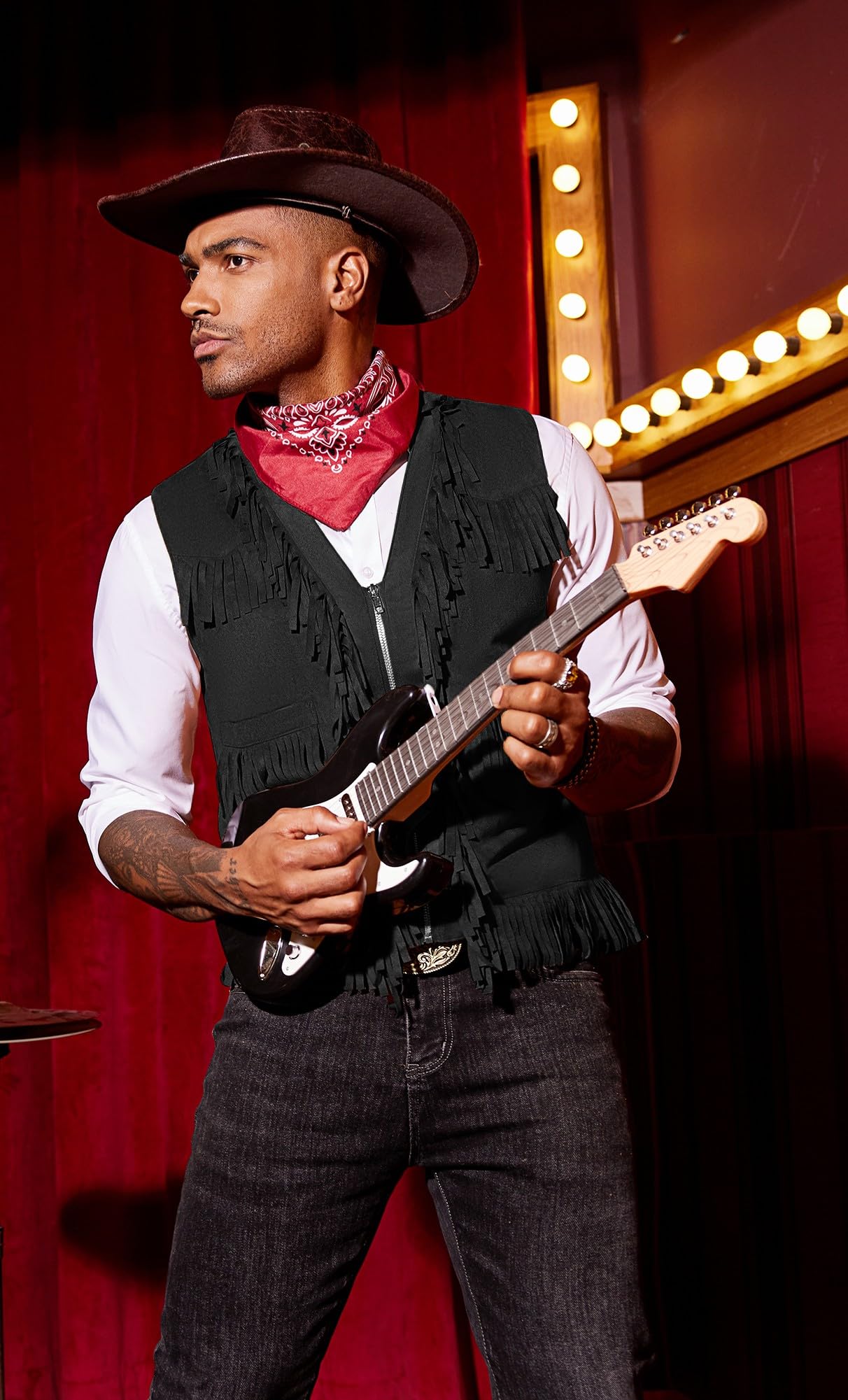 COOFANDY Men's Western Cowboy Vest Halloween Fringe Hippie Costume V Neck Zipper Suede Leather Waistcoat