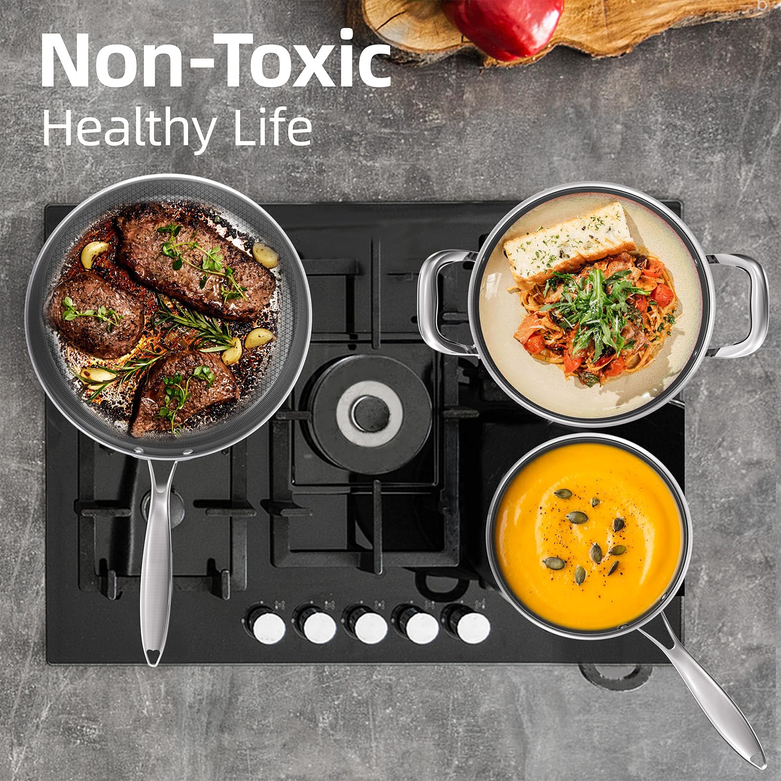 • 【Non-Toxic Frying Pans Set】: The frying pan set is made of 3-ply food-grade stainless steel to ensure even and fast heat distribution without harmful coatings and is free from harmful materials such as PFOA, PTFE, PFAS, lead, cadmium and toxic metals