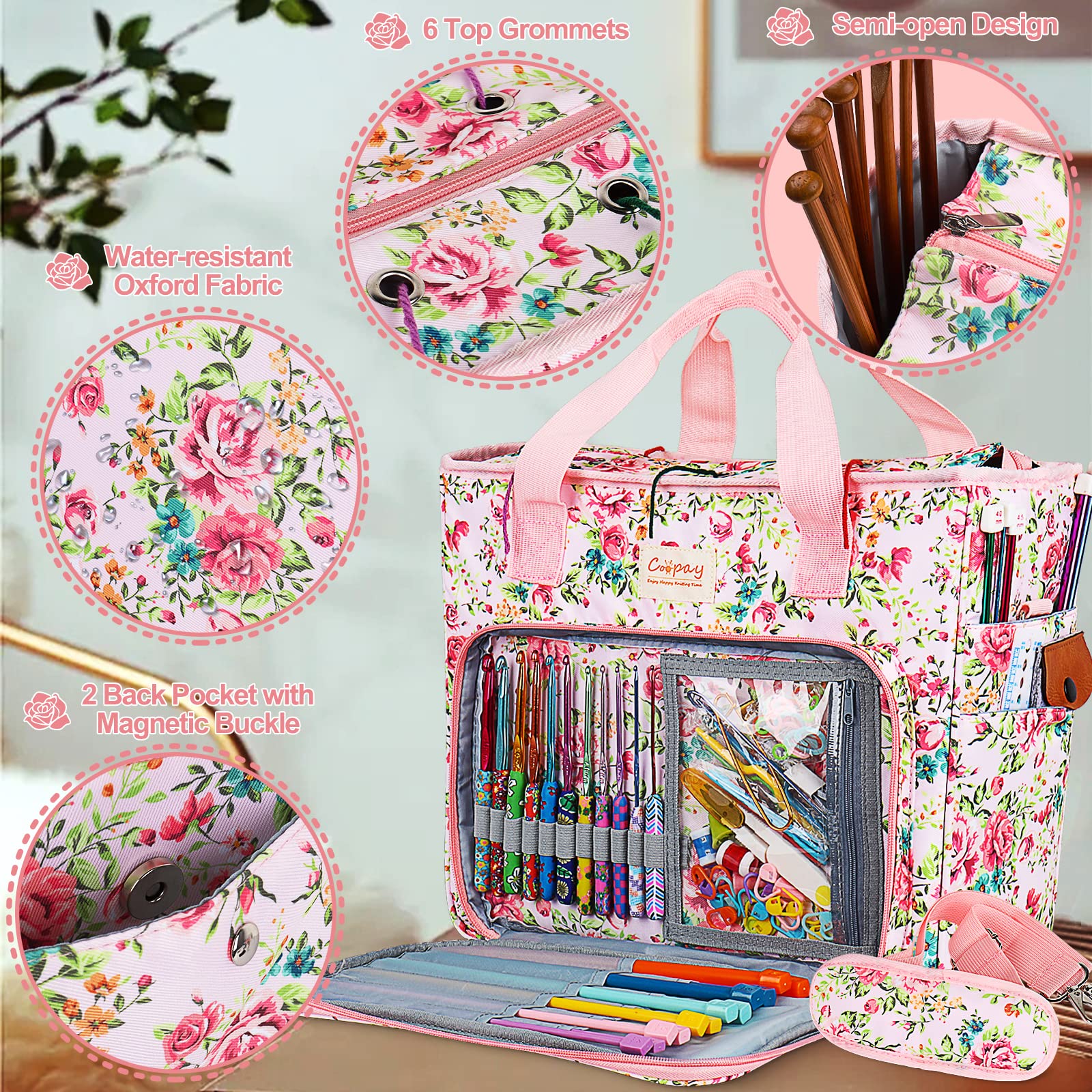 Coopay Large Crochet Bag Knitting Bags and Totes Organizer, Traveling Crochet Bags Yarn Bag for Carrying Crochet Hooks, Knitting Kit, Skein Yarn Wool, Project, Knitting & Crochet Supplies, Pink Flower