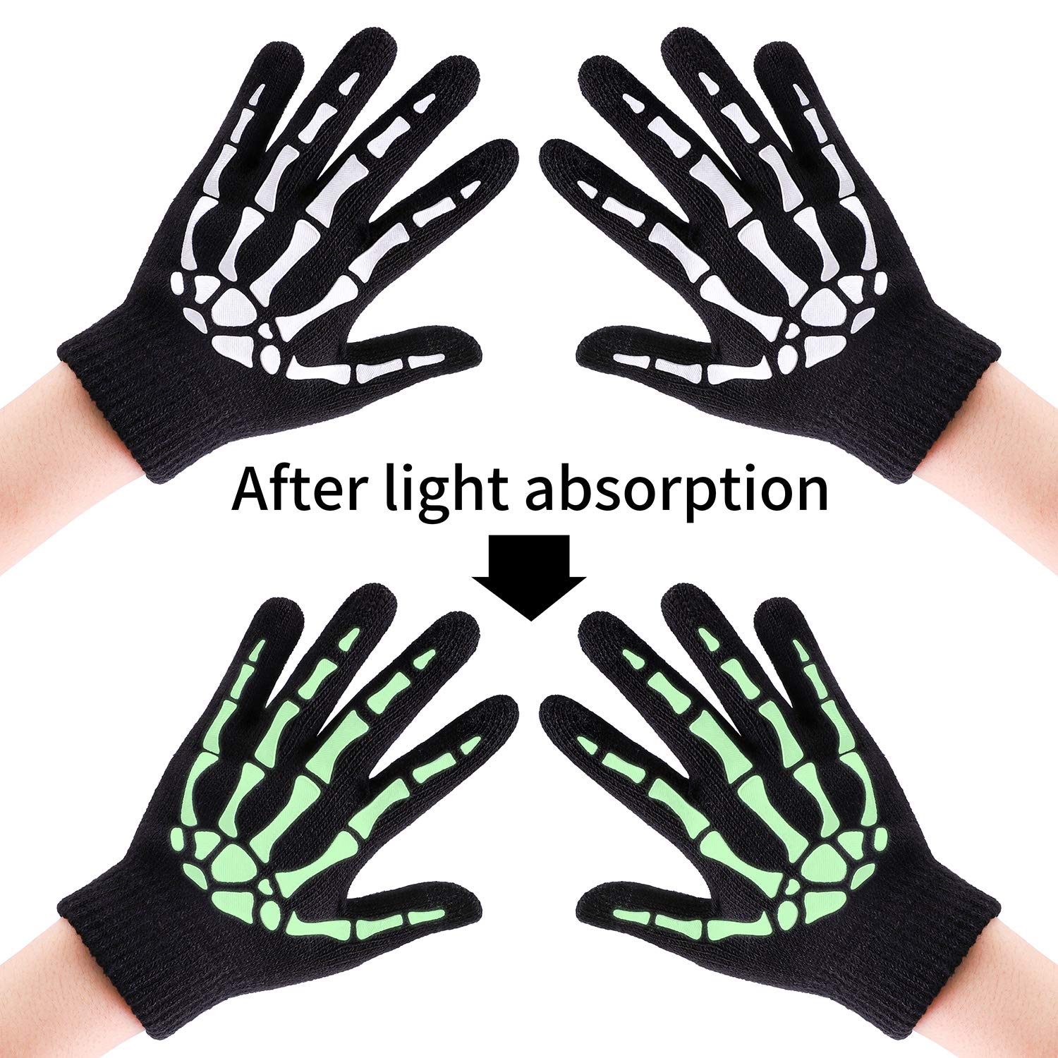• Luminous gloves: the white skeleton on the gloves fluoresces in dim light, adding novelty and fun to your outfit and making them great costume accessories for Halloween role-playing; (white patterns need to absorb light sources, such as light or flashlight)