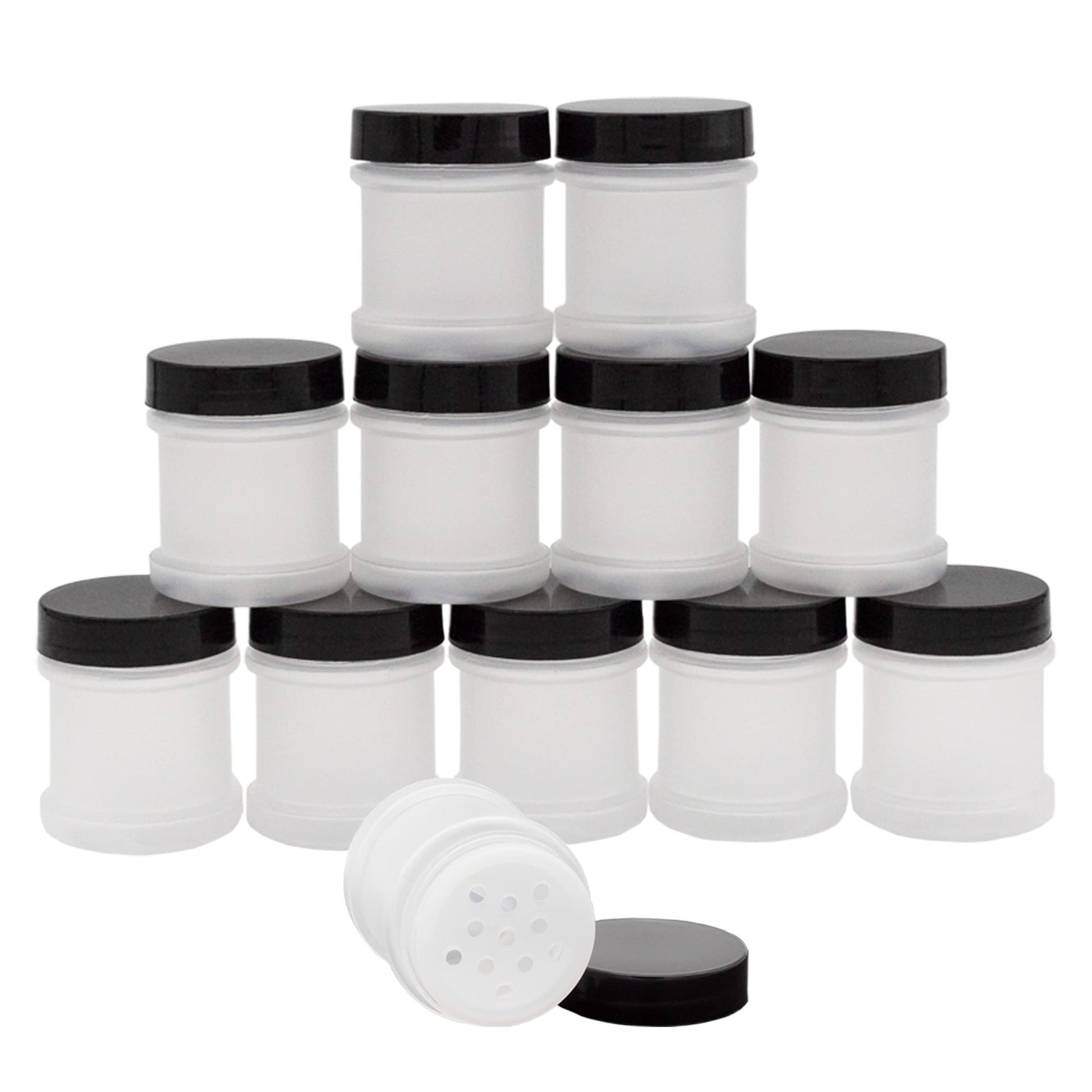 Cornucopia Brands Mini Plastic Spice Jars w/Sifters (12-Pack, Black); 2 Tablespoon Capacity (1 Fluid Ounce) Spice Bottles for Travel, Glitter, Gifts, Favors