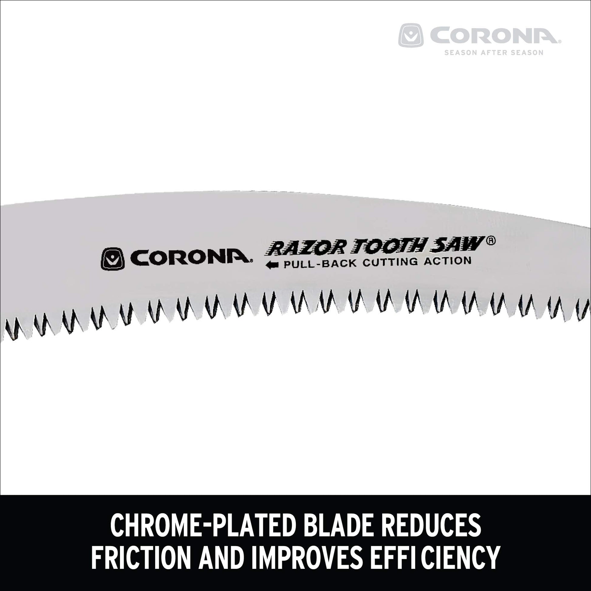 Details: Combining RazorTOOTH SAW® technology and an ergonomic non-slip handle, this 10-inch Corona folding saw gives you a confident and comfortable grip while efficiently cutting through green or dry branches with twice the speed of a conventional hand saw. The 10-inch curved blade has an extended reach and can cut branches up to 6-inches in diameter, making it ideal for tree trimming and a great addition to your workshop or essential gardening hand tools. When folded, the handle fully covers the teeth of the blade for safe, compact storage and easy transportation when camping, backpacking, hiking or ATV riding.