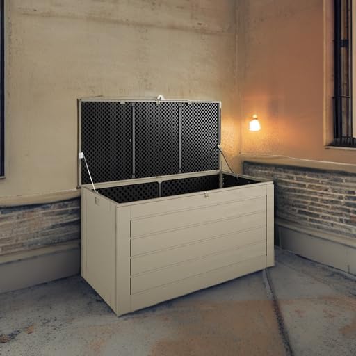 Details: Introducing the Cosco Outdoor Living 88180BTN1E Extra Large 180 Gallon Tan Deck Storage Box, the perfect solution to keep your outdoor space organized and secure. This spacious deck box offers a generous 24 cubic feet of storage capacity, ideal for storing large cushions, garden tools, sports equipment, and pool supplies. Say goodbye to backyard patio pirates with the sturdy steel frame and lockable lid, designed to protect your belongings from thieves, nosy neighbors, and stray animals. Constructed with durable, weather-resistant materials, this deck storage box features UV-protected double wall panels that are waterproof and built to withstand the elements. The tan frame and brown lid complement a wide range of home exteriors, adding a touch of elegance to your outdoor space. The hinge design allows the lid to stay open without the risk of falling on your fingers, providing easy access to your stored items. With exterior dimensions of 57.71' W x 27.95' D x 29.5' H and interior dimensions of 54.5' W x 25.5' D x 27.5' H, this deck storage box offers ample space for maximizing storage efficiency. Whether you're looking to protect your outdoor furniture cushions or keep your gardening tools organized, this XL storage box is the perfect solution. Cosco Outdoor Living is a trusted brand known for its innovative and stylish outdoor furniture collections. Designed with both form and function in mind, our products are built to last and impress. Choose Cosco Outdoor Living for all your outdoor patio needs and create the outdoor space of your dreams. Sit back, relax, and enjoy your outdoor living experience with Cosco Outdoor Living furniture. Add this patio storage box to your outdoor space today and enjoy the convenience and security it provides.