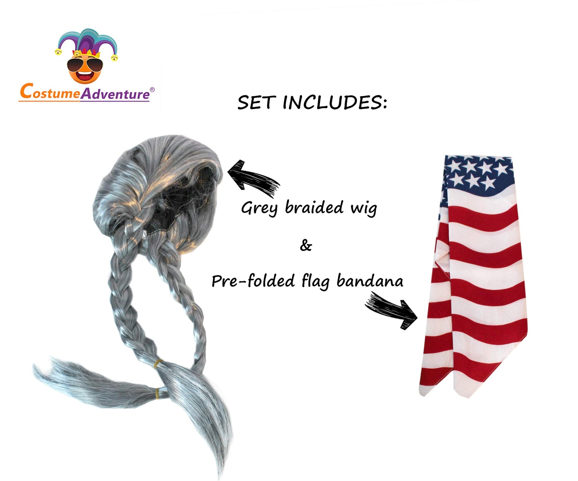 • One Grey Braided Hippie Wig For Men With Bandana - This wig set comes with a grey wig with braids and a separate American Flag Bandana. Makes for a fun hippie wig