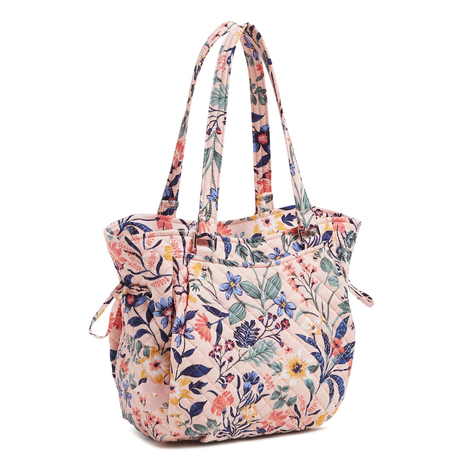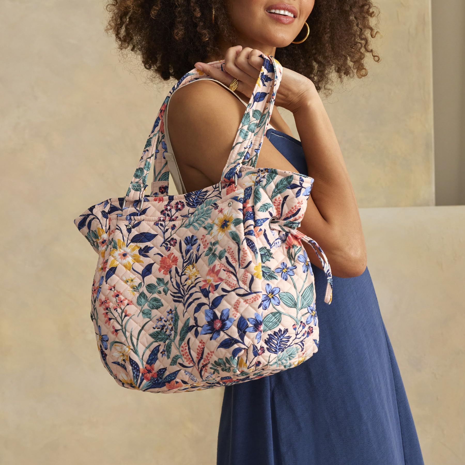 Signature cotton is colorful and lightweight. Exterior has a hidden zip and 2 slip pockets. Interior has 3 slips and a zip pocket. Drawstring to adjust the size of the bag. Zip closure. Machine wash cold gentle cycle. Use non-chlorine bleach as needed, line dry. Vera Bradley makes your new favorite handbag - whether you are looking for a crossbody, a satchel, a wristlet, a hobo, or a clutch, we have your hand bag needs covered, including pockets and organization for your phone and other valuables.