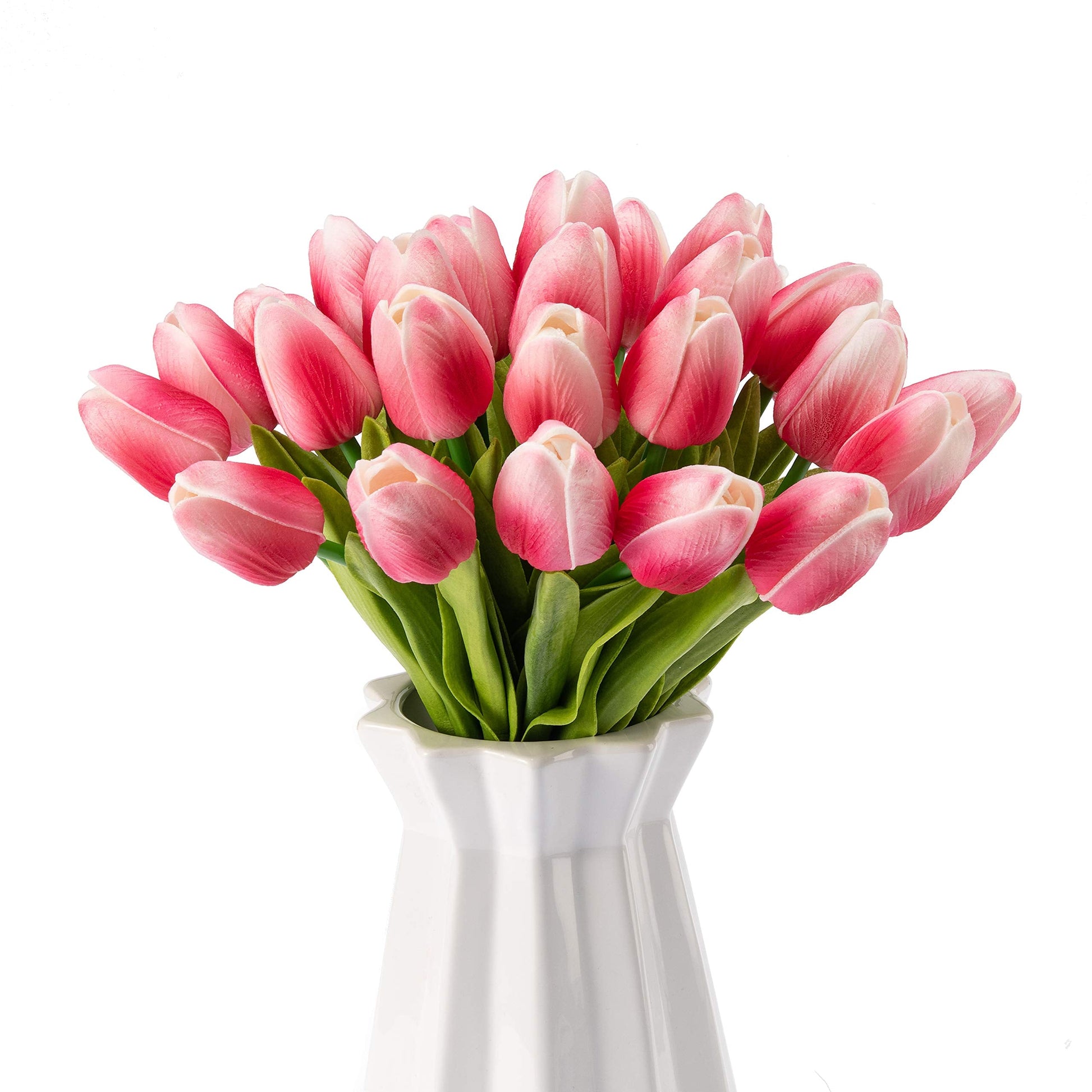 Crafare 27PC Spring Artificial Tulips Flowers Real Touch Tulips for Valentines Day Wedding Bouquets Floral Arrangement and Home Room Centerpiece Party Decor(Double Pink)