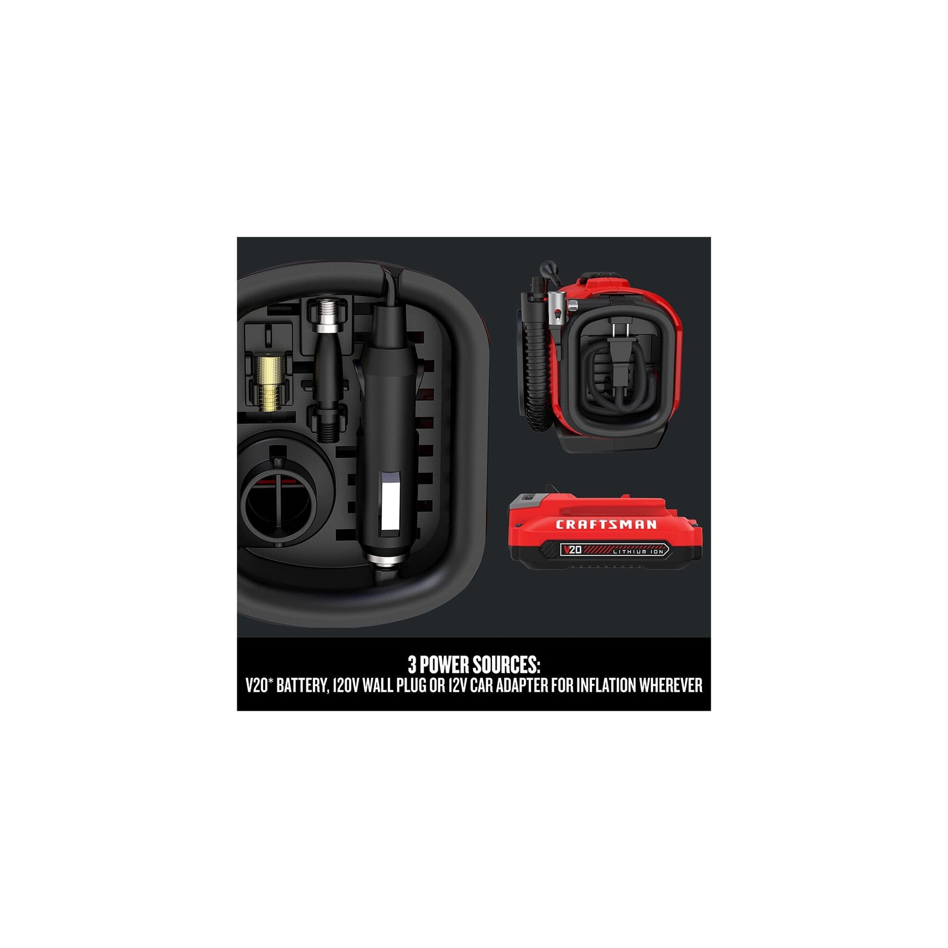 CRAFTSMAN V20 Tire Inflator, Portable Air Compressor, 3 Modes: Cordless, 120V Corded, and 12V Car Adapter, Air Pump, Battery Sold Separately (CMCE520B)