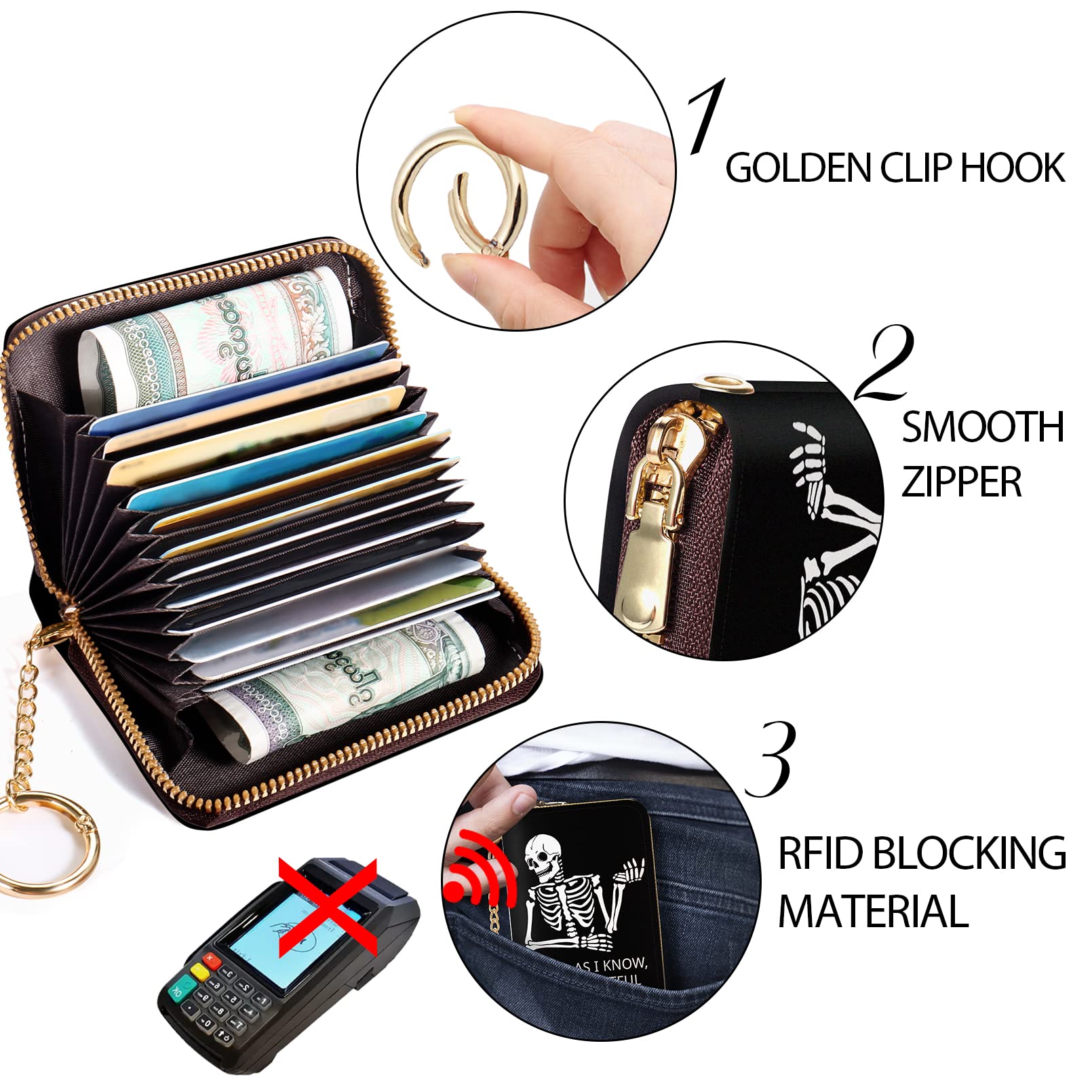 Credit Card Holder RFID Wallet, Funny Skeleton Card Holder Wallet for Women with Keychain Zipper, Small Gothic Leather Print Credit Card Wallets Accordion Gift