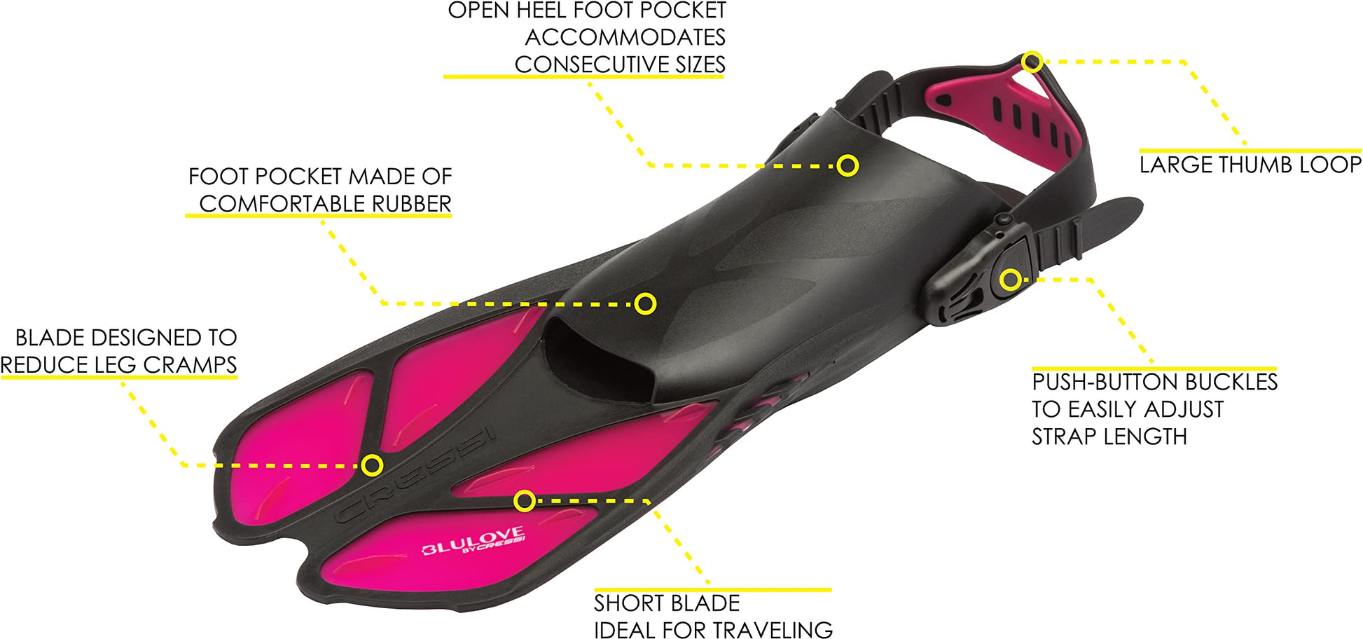 Details: The Cressi Bonete fins are short, open-heel fins with adjustable straps. The redesigned buckle system increases the sturdiness and ensures a long lifespan. The fin strap features a large thumb loop to make donning and doffing easy. They can also be hung on a hook for drying. The foot pocket is made of a rubber material for comfort and adapts to all feet. This open-foot pocket fin comes with an adjustable strap, which allows it to be shared between different people in a similar foot size-range. The composite design of the blade provides comfortable finning and helps reduce leg cramping. The fins are ideal for travelers due to their compact dimensions and light weight. The Bonete fins are designed by Cressi and made in China. Cressi has been an Italian brand pioneer in scuba diving, snorkeling, and swimming equipment since 1946..