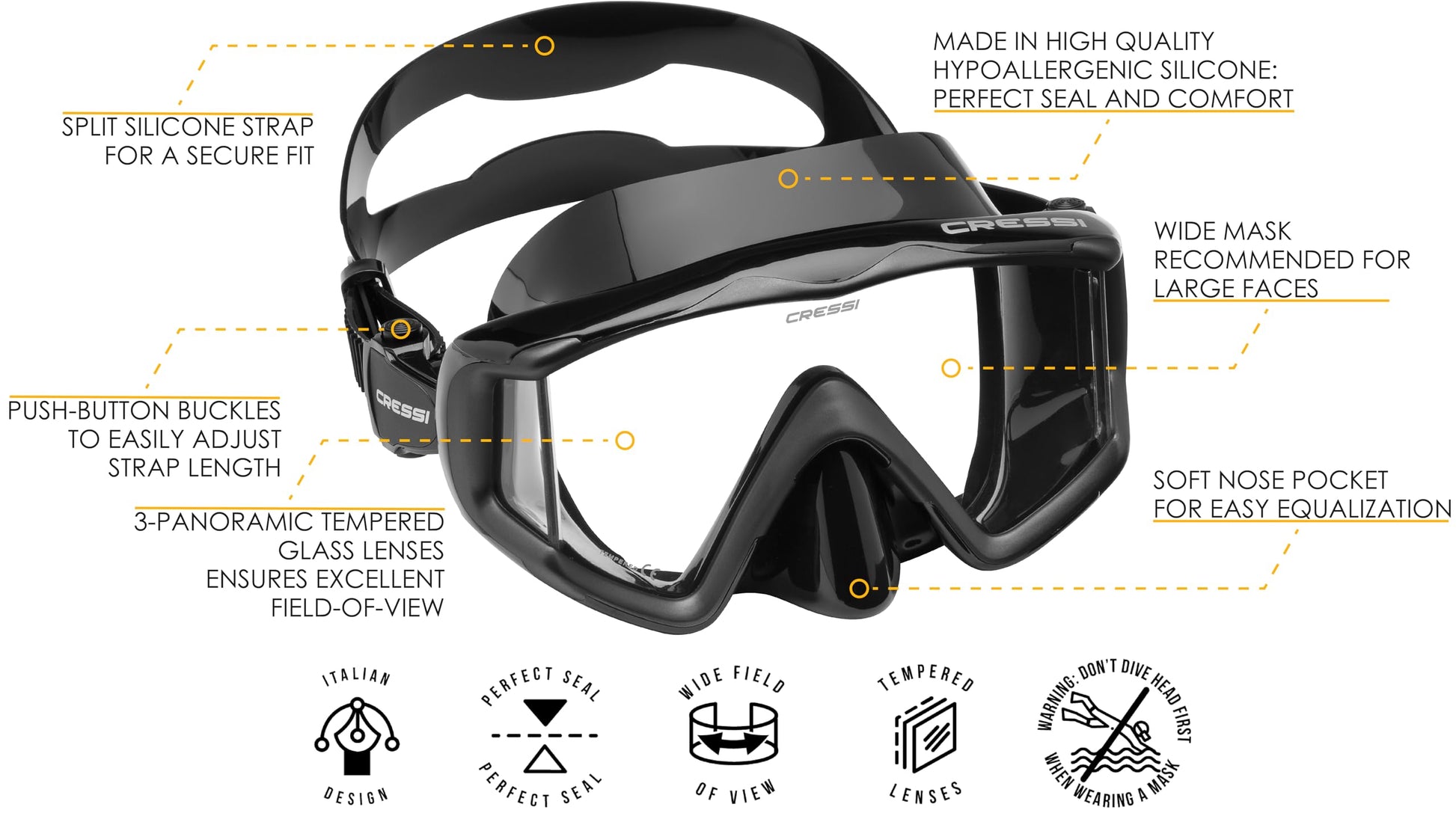 • 3-window mask made with Tempered Glass, Low Volume Design, Easy to Clear. Ideal for Scuba Diving and Snorkeling.