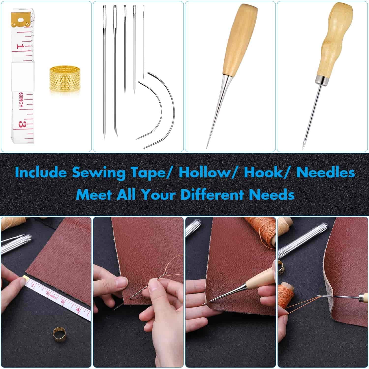 • 35Pcs Leather Sewing Tools: Cridoz leather sewing tools kit includes 4pcs 4mm stitching prong punch (1 Prong/ 2 Prong/ 4 Prong/ 6 Prong), 8 rolls color waxed threads, 1 awl, 1 leather sewing piercing tool, 1 sewing thimble, 1 measuring tape and 19pcs large-eye stitching needles, great for leather craft lovers or beginners