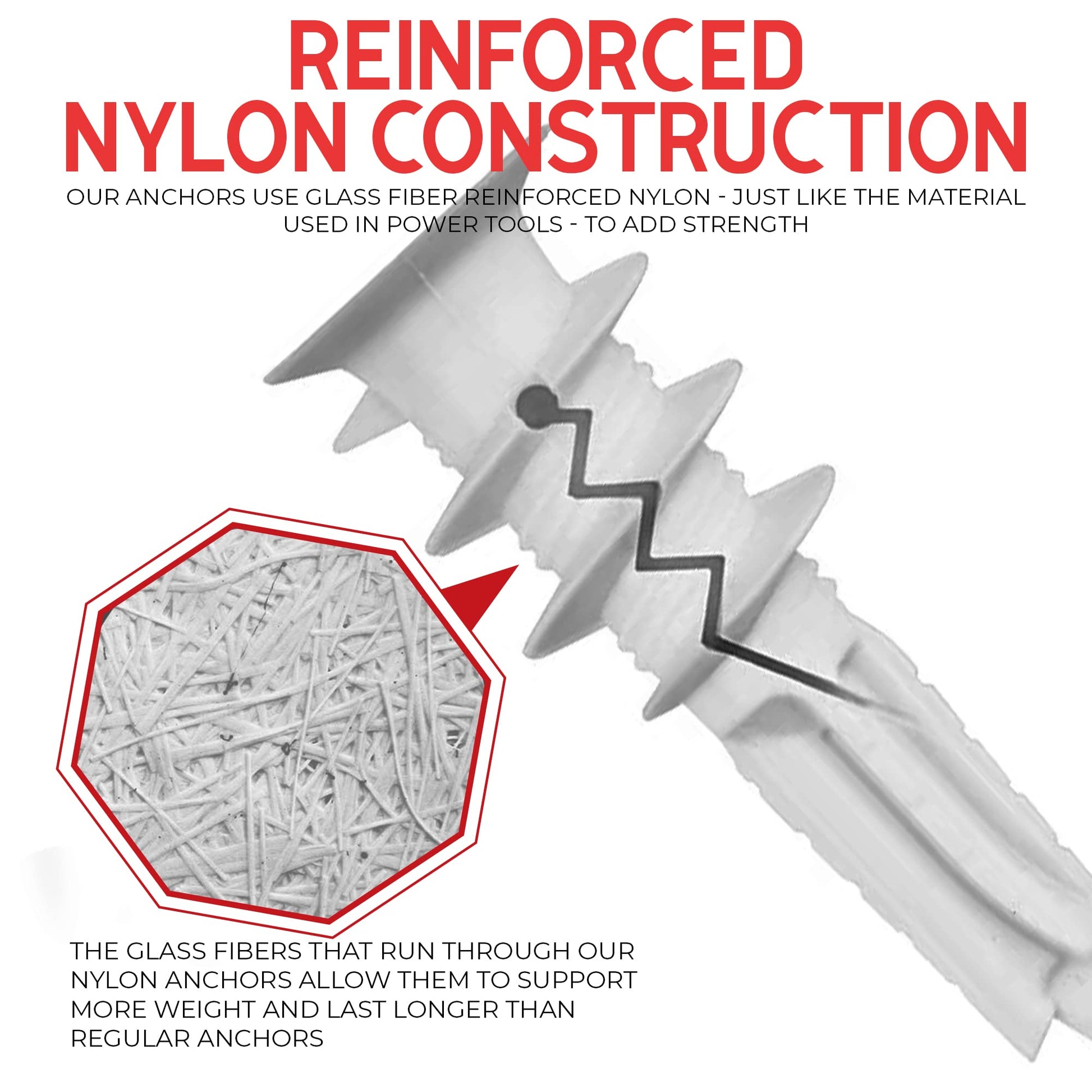 • NOT LIKE OTHER ANCHORS: These heavy duty drywall anchors have strong ribs which can holds 75lbs weight and will keep our anchors stable in your drywall. Made of high-quality nylon plastic mixes with highly robust glass fibers.