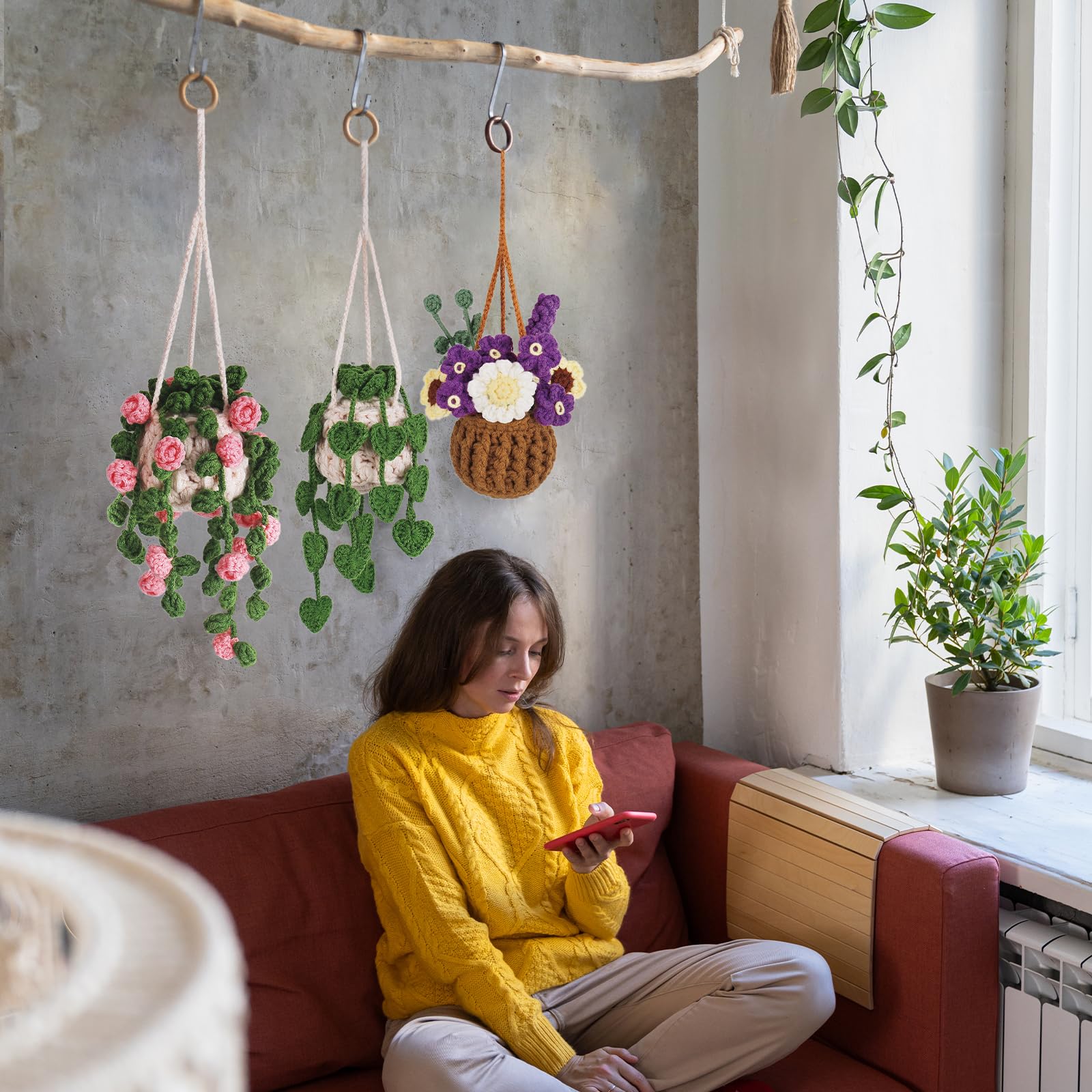 • All-In-One Crochet Starter Kit: CROCHETTA beginner crochet kit includes everything you need to start: 5 different colored yarns, ample stuffing, 2 yarn needles,5 stitch markers, 2 ergonomic crochet hooks, 1 pair of scissors, 1 crochet 3 Hanging Plants pattern, and a beginner's basic crochet manual.