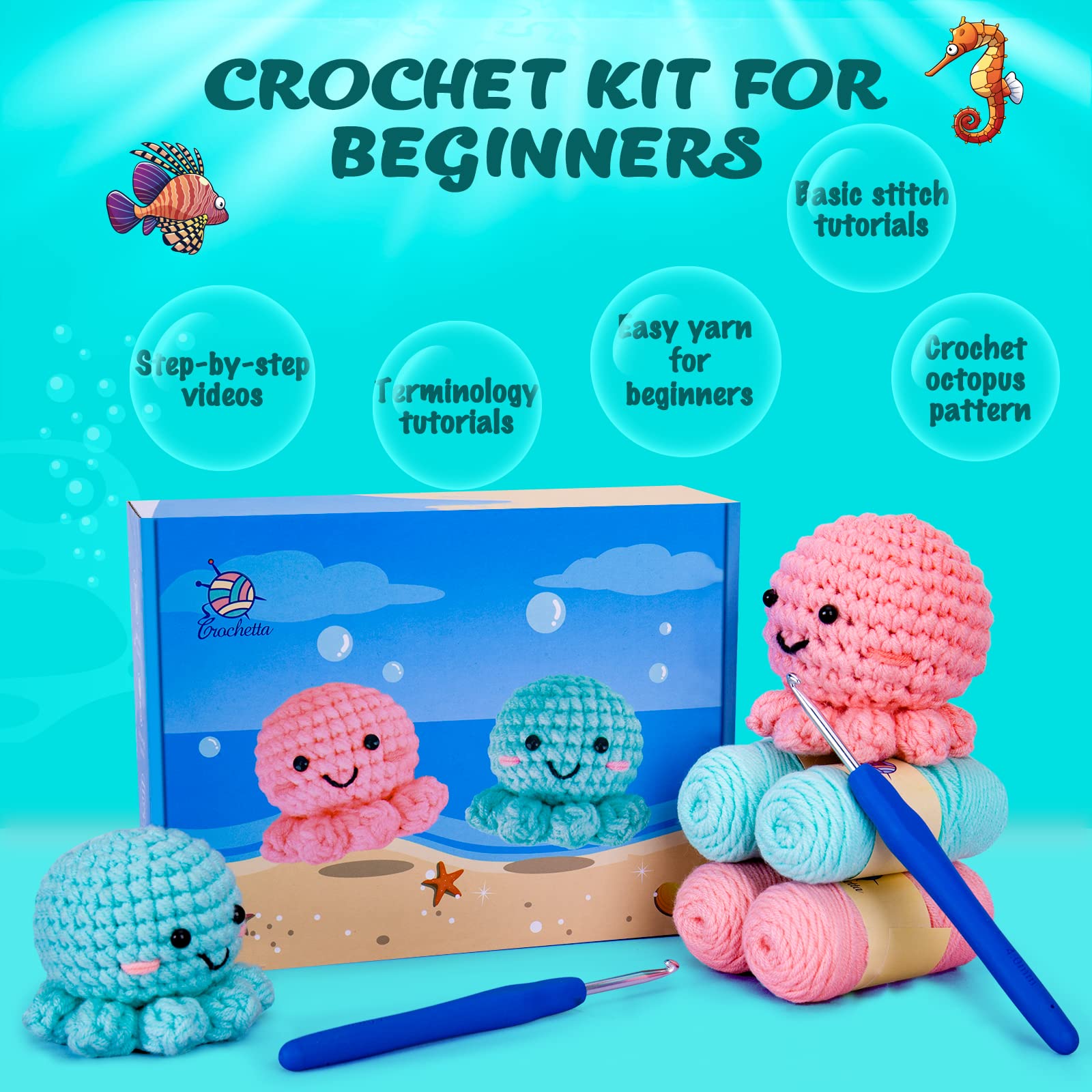 Crochetta Crochet Kit for Beginners, Amigurumi Crocheting Animals Kits w Step-by-Step Video Tutorials, Knitting Starter Pack for Adults and Kids, Jumbo 2 Octopus Familly (40%+ Yarn Content)