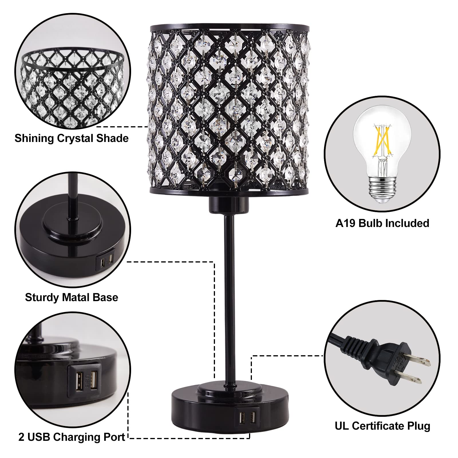 • Convenient 2 USB Charging Ports: The crystal lamp allows you to charge the mobile phones, tablets, power banks, kindle readers, smart watches or other electric devices, reduces the clutter of power cubes, no need for moving furniture to access outlets. The USB ports function regardless of whether the lamp is on or off