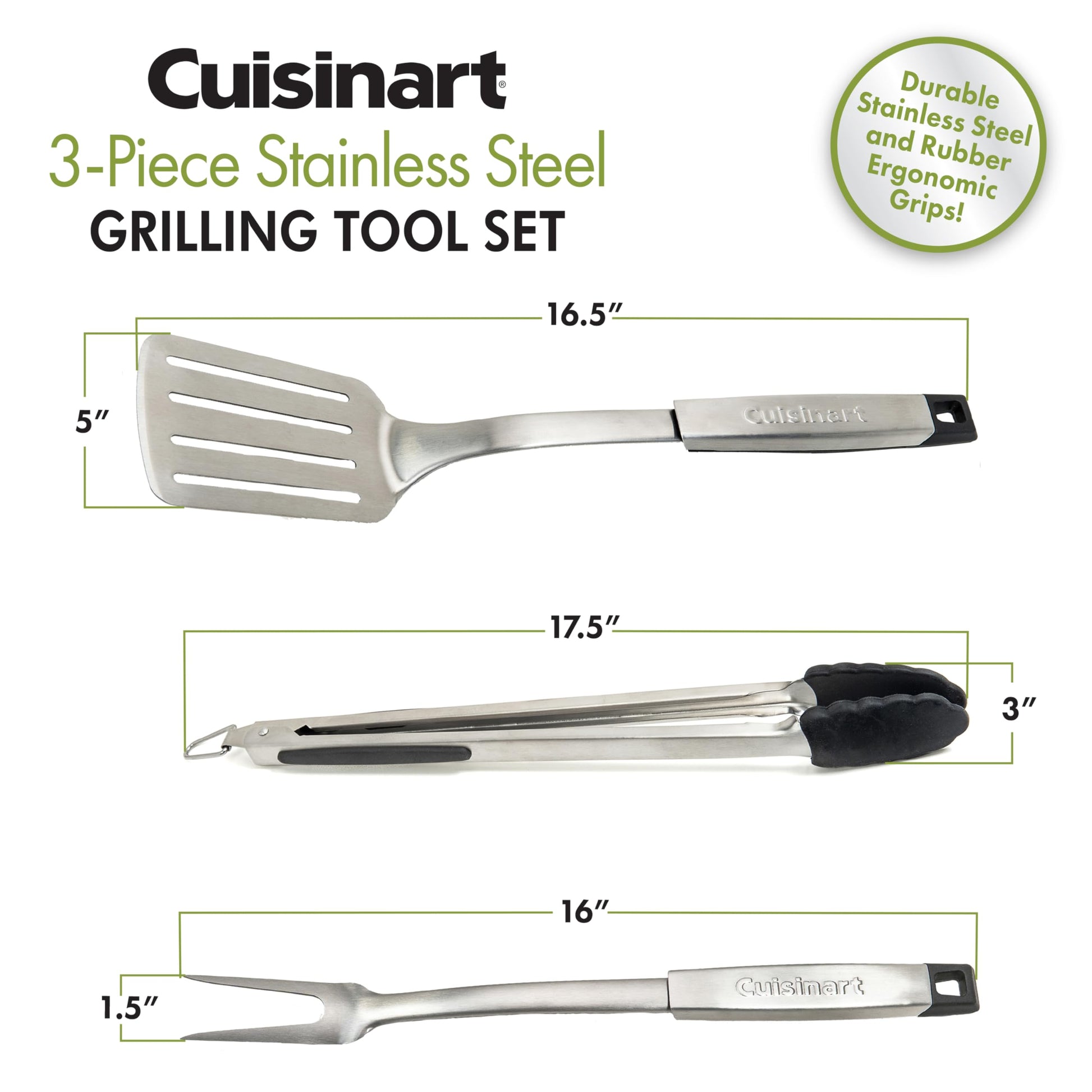 • Optimal grilling length Features: Set includes Spatula Tongs and Fork|Stainless construction|Rubber grips