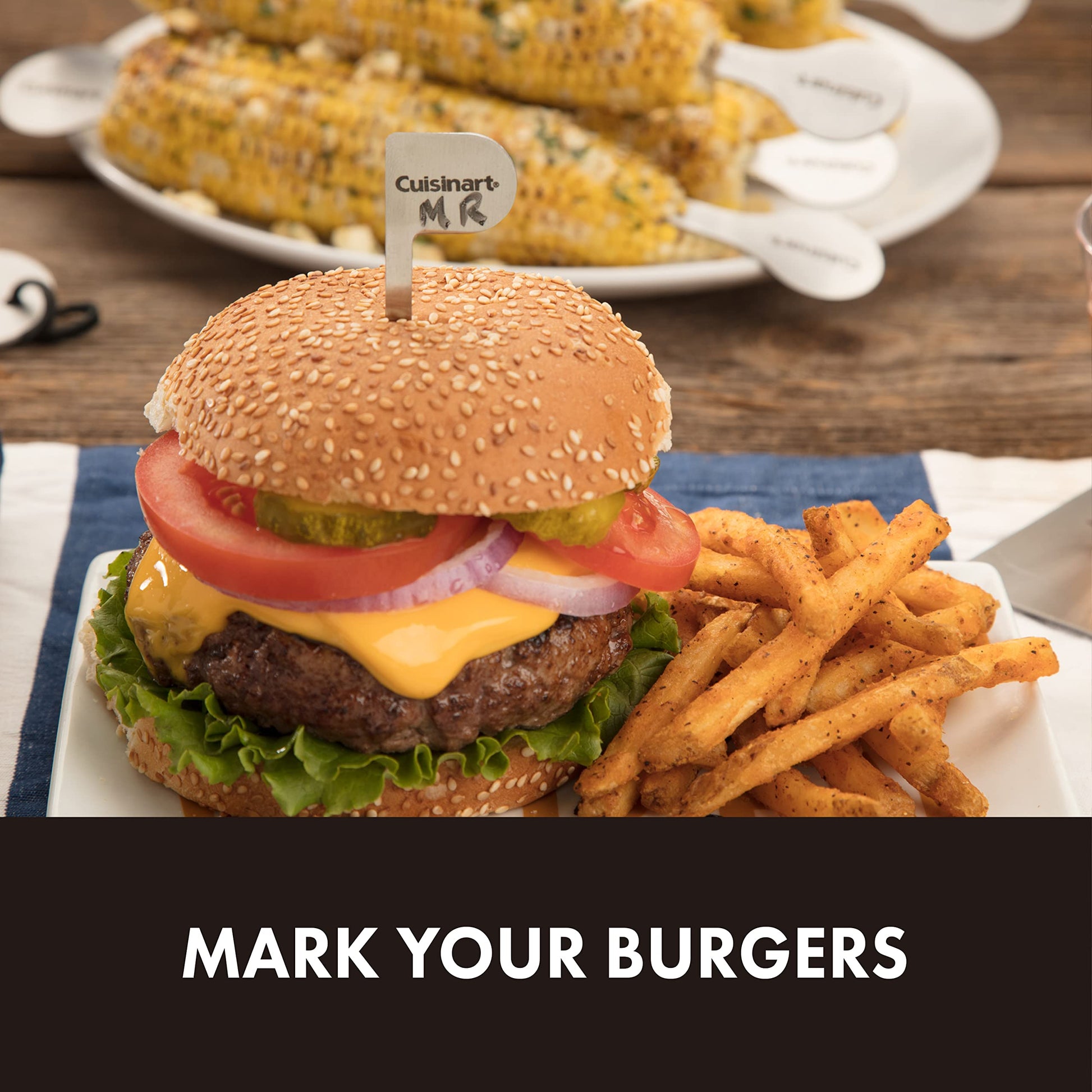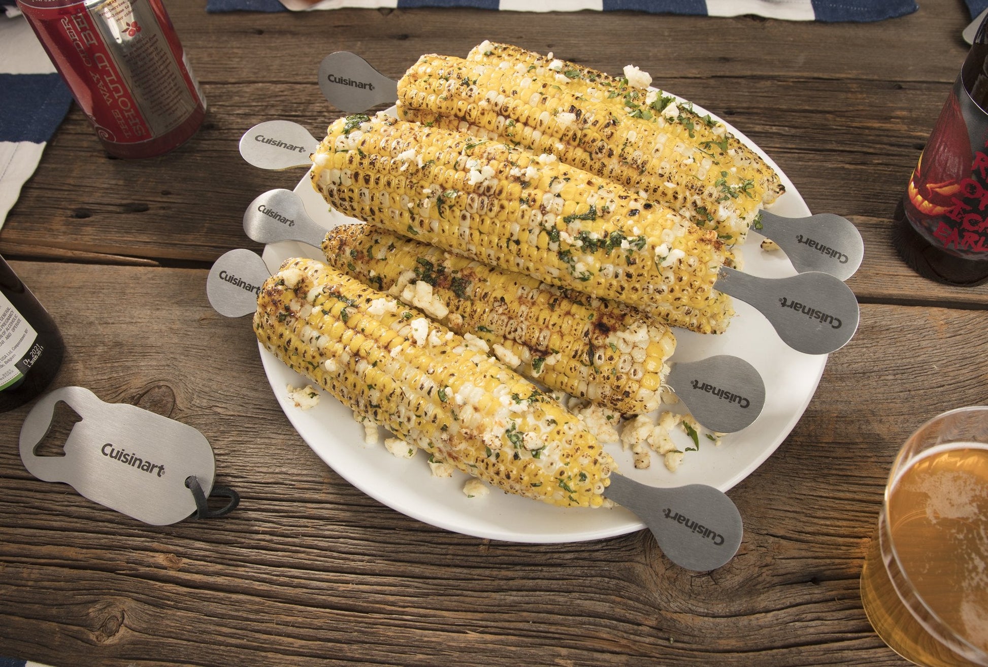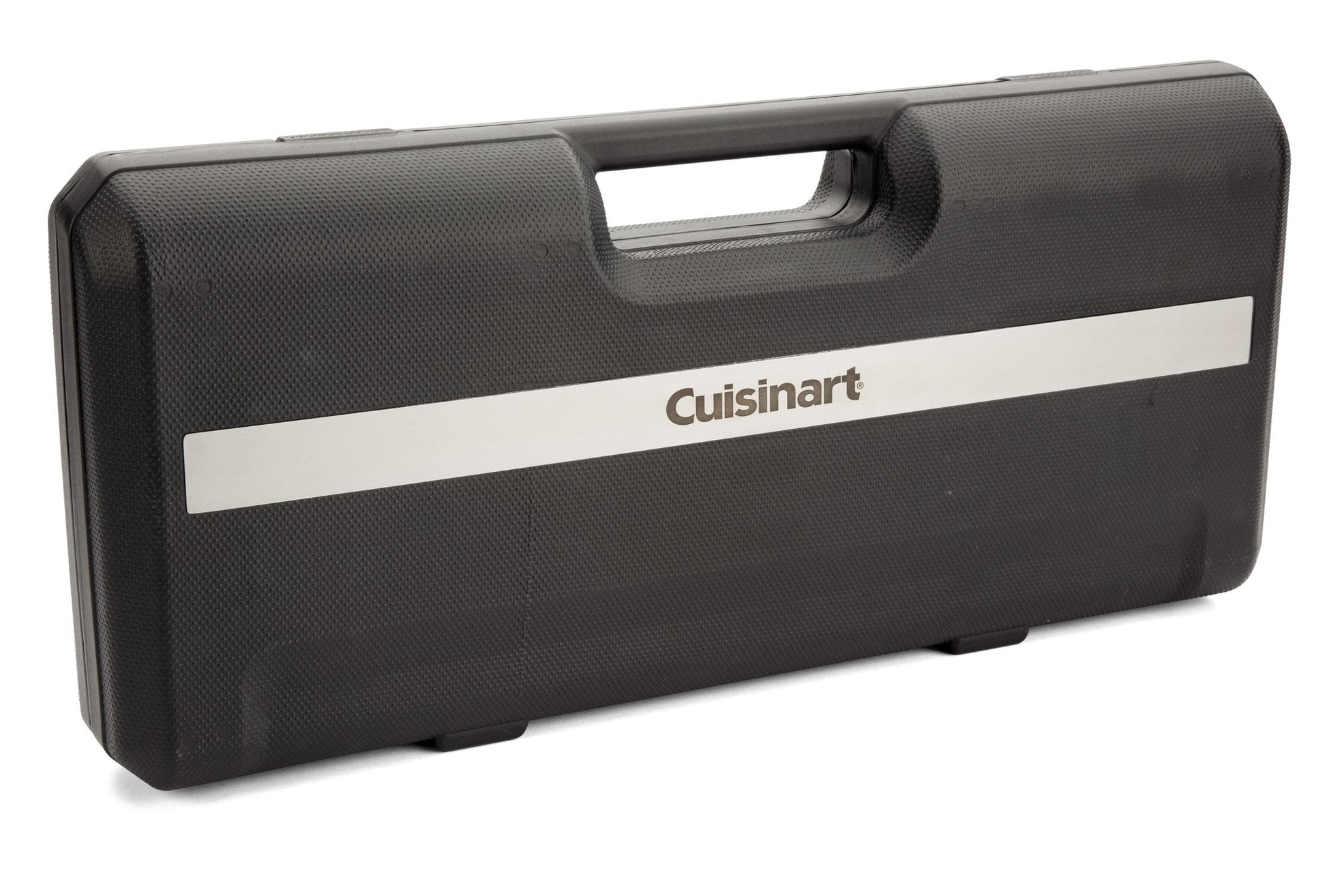 Details: The Cuisinart 36-Piece Backyard BBQ Tool Set is the ultimate kit to help make any barbecue a success. This comprehensive set totals 36 pieces, which includes a recipe book and a temperature guide to help you with some new BBQ creations. The spatula, tongs and fork are made from durable stainless steel and feature stylish, ergonomic handles. The basting brush comes equipped with a silicone brush head as well as a replacement silicone head and replacement mop brush head. The 6 stainless steel skewers are perfect for creating delicious kebabs, or grilling vegetables, shrimp, scallops and more! When handling those hot skewers, use the heat-resistant silicone glove to safely transfer food to and from the grill. The 8 stainless steel corn holders slide in effortlessly and provide a cool and comfortable grip when handling hot corn on cob. Top your burgers off with one of the 10 burger flags and even mark them with your initials so everyone at the party knows who's burger is who's. When finished grilling, use the saw tooth grill scraper to give your grill grates a nice detailed cleaning. Top it all off by cracking open a beer with the bottle opener! All these tools fit perfectly into their own spots in the storage case so everything stays in one place, ready for the next barbecue.
