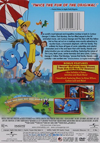 Young children, and monkeys, thrive when they enjoy a close relationship with their families and caregivers, but their innate sense of curiosity is bound to get these young members of society into trouble from time to time. In Curious George 2: Follow That Monkey, the Man with the Yellow Hat (Ted) is up for a promotion to museum director at the Bloomsberry museum--all he has to do is convince the board of directors that he's the best man for the job. As Ted focuses in on his priorities for the museum's future, some gentle prodding from his monkey George and woman friend Maggie remind him that those you care about need to be high on one's priority list as well. A trip to Piccadilly's circus seems like just what George, Maggie, and Ted need, but when Ted 'volunteers' for a magic trick that goes terribly wrong, George and the circus's elephant Kayla wind up missing. What ensues is a perilous and adventure-filled cross-country train chase that ends with an insightful lesson about the importance of family, perseverance, and doing what's right. The great thing about this film is that the animators have preserved the simple, colorful style of the original book illustrations for Margret and H. A. Rey's Curious George, while adding in some distinctly modern touches. Also, the voice talent, music, and script are very effective at re-creating the tone of the books. There are, however, two starkly strange elements in this film: the private investigator character Danno Wolfe and the television reporter Hark Hanson. Perhaps the introduction of these characters was just another attempt to modernize the story, but the cynical detective and sensationalist television personality seem completely out of place in the innocent world of Curious George. Nonetheless, toddlers, young children, and even their parents can't help but delight in the simple antics of this very curious monkey named George and his caregiver the Man with the Yellow Hat. --Tami Horiuchi