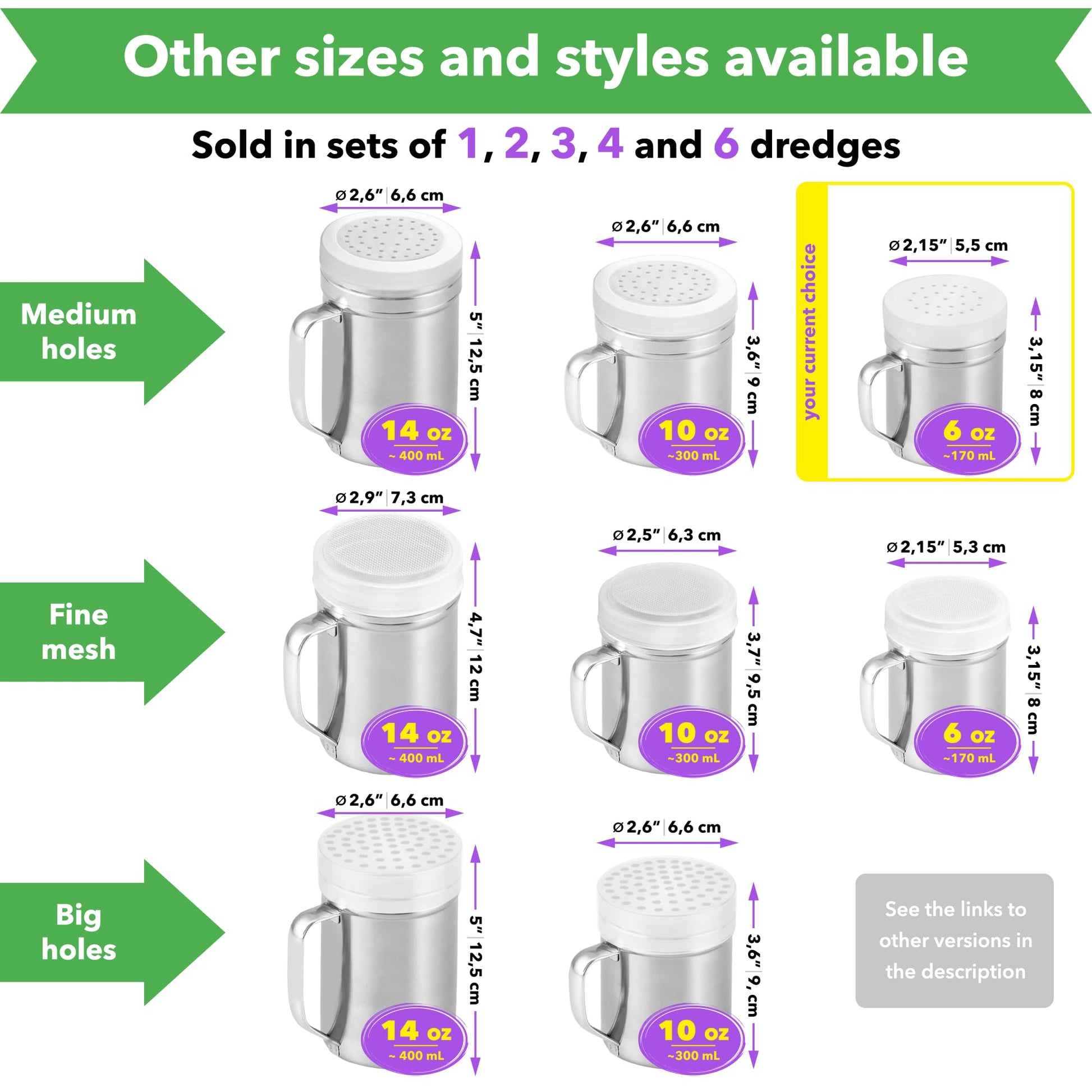 • You will receive two stainless steel cooking dredges (6 oz) with handles, metal twist-off lids, and plastic caps; style: medium