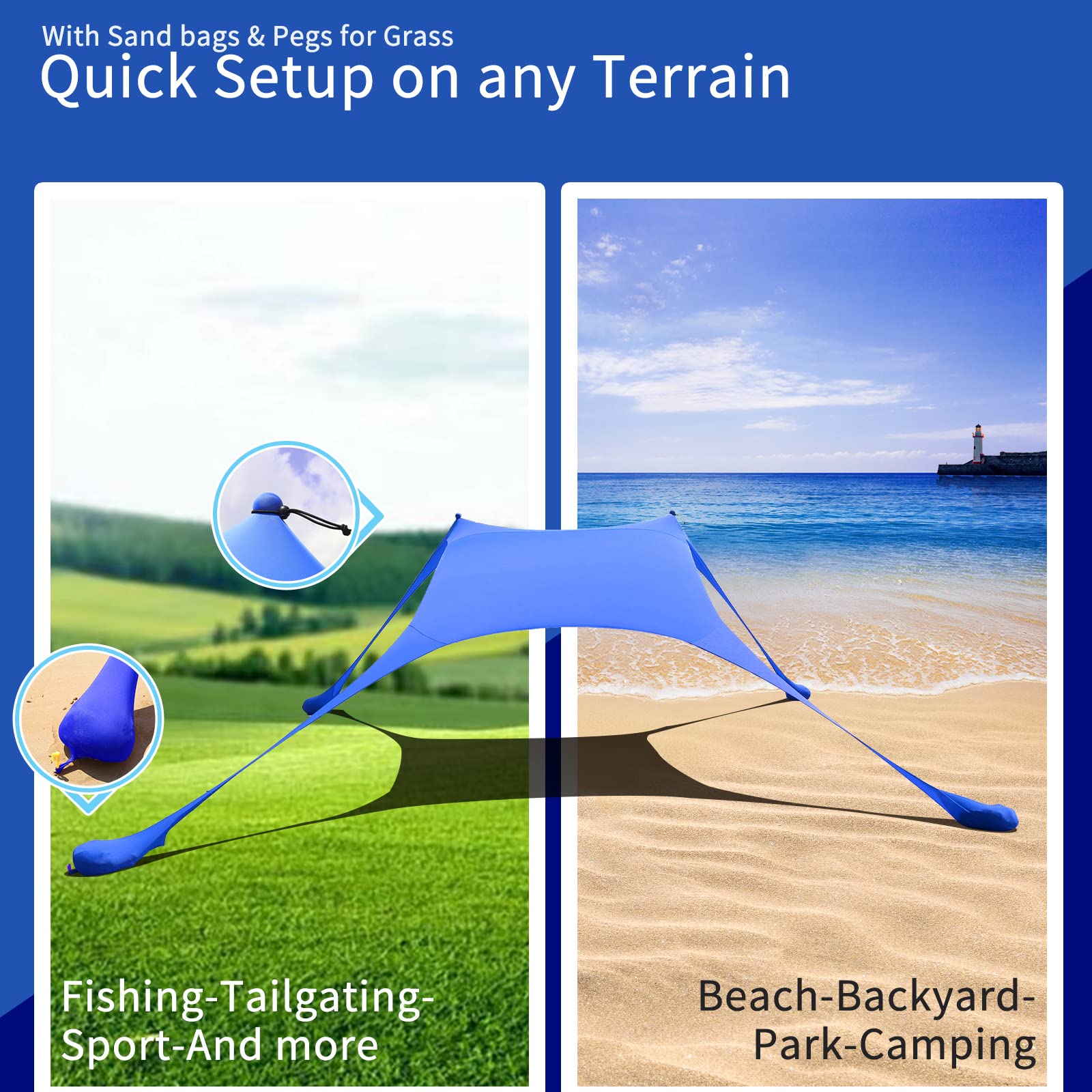 • 【EXCELLENT SUN SHELTER】Our beach sunshade with two 6.5 ft high aluminum poles, the size is 7*7 ft, it provides excellent shade for 4-5 adults, extra large sand anchor and high quality rust proof Aluminum pole, it holds up well in the wind. ​Make sure to use the included rubber bands to secure the poles to the tent and fill the sandbags completely, you can also use ground pegs for extra stability