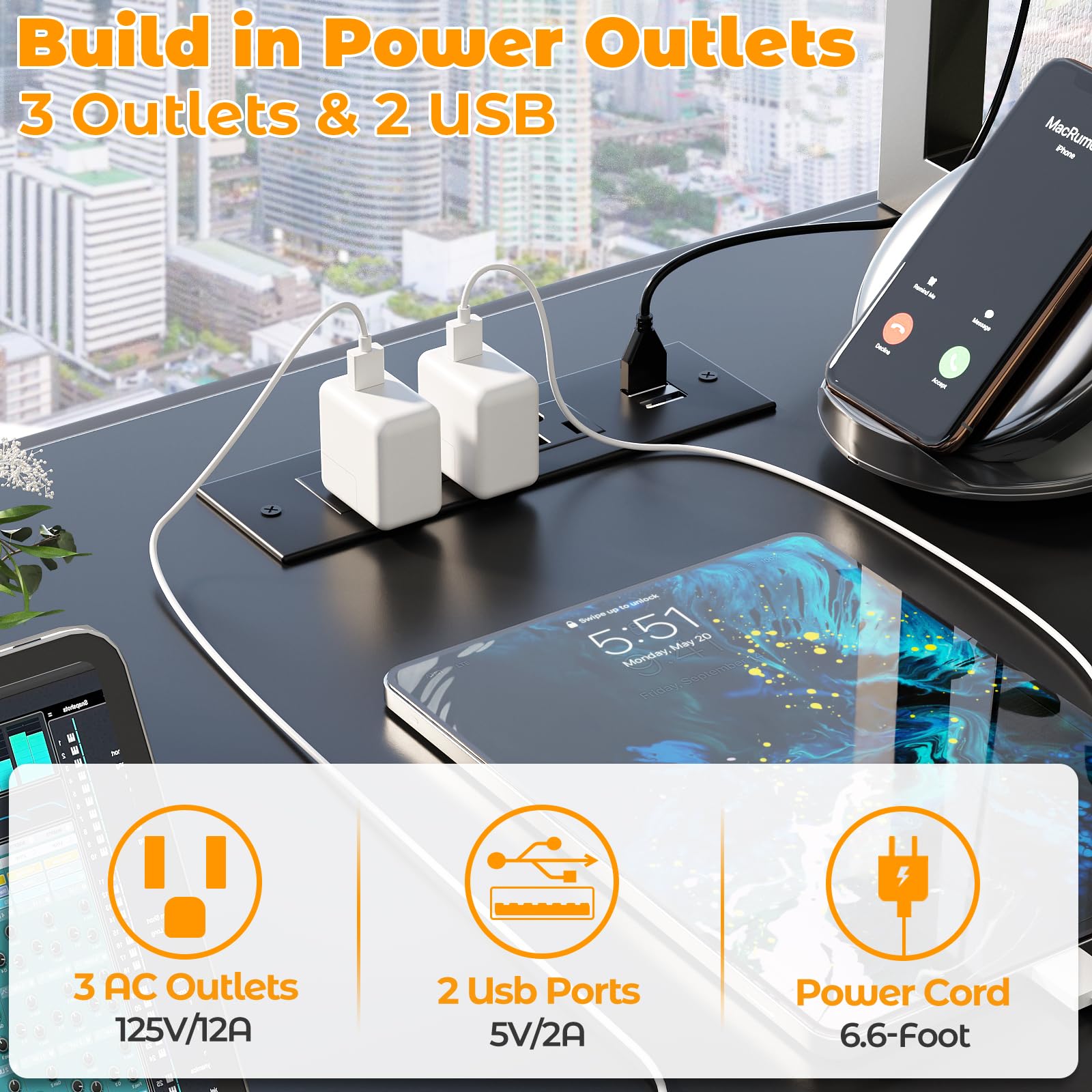 • 【Smart LED Light Strips & Power Outlets】 Build in 60000+ colors LED lights, designed with timer, music sync function, built-in sensitivity mic, led light will dance with music rhythm. All can provide you with a magical and excellent gaming experience. The gaming table is equipped with 3 Outlets & 2 USB on the desktop, so you can charge your devices beside your hand and don't have to go to other places.
