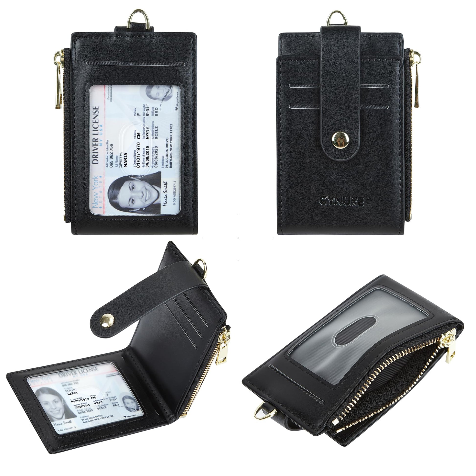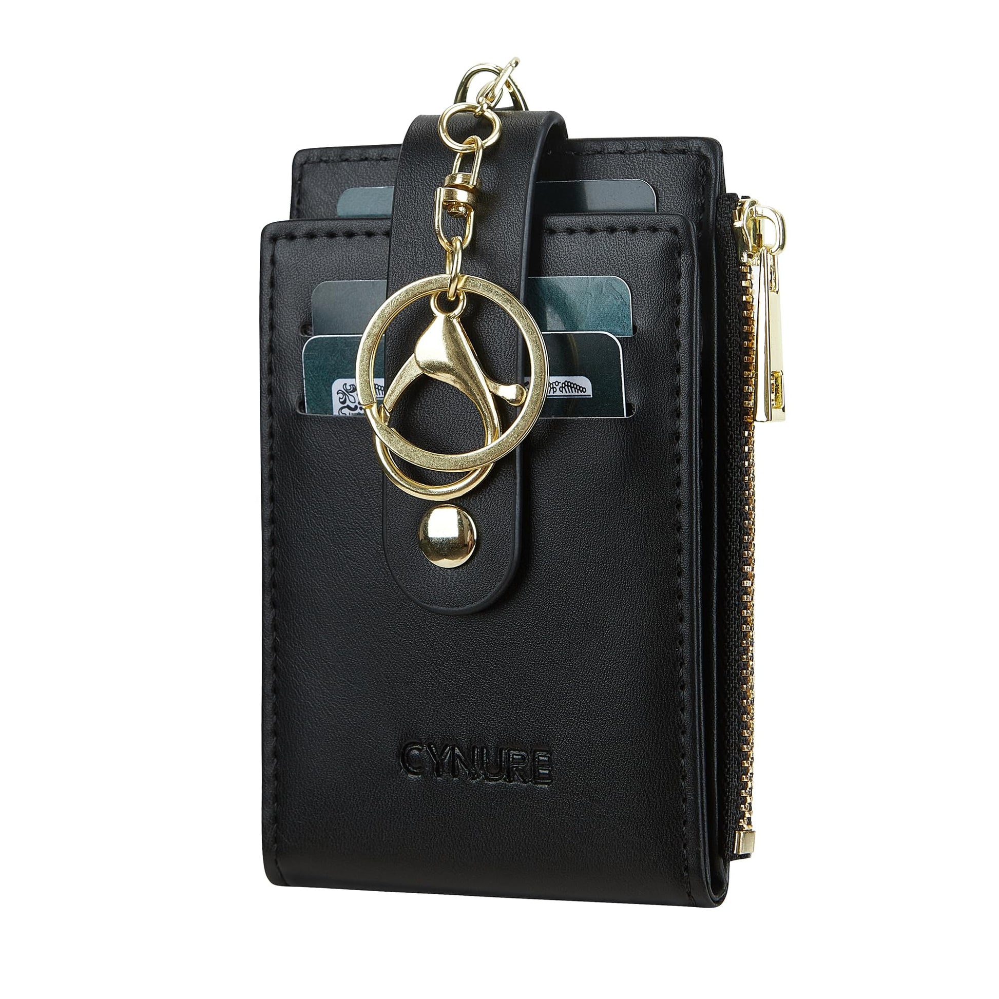 Cynure Women & Men Leather RFID Blocking Card Holder Slim Small Zipper Keychain Front Pocket Wallet with 2 ID Window, 1-plain black