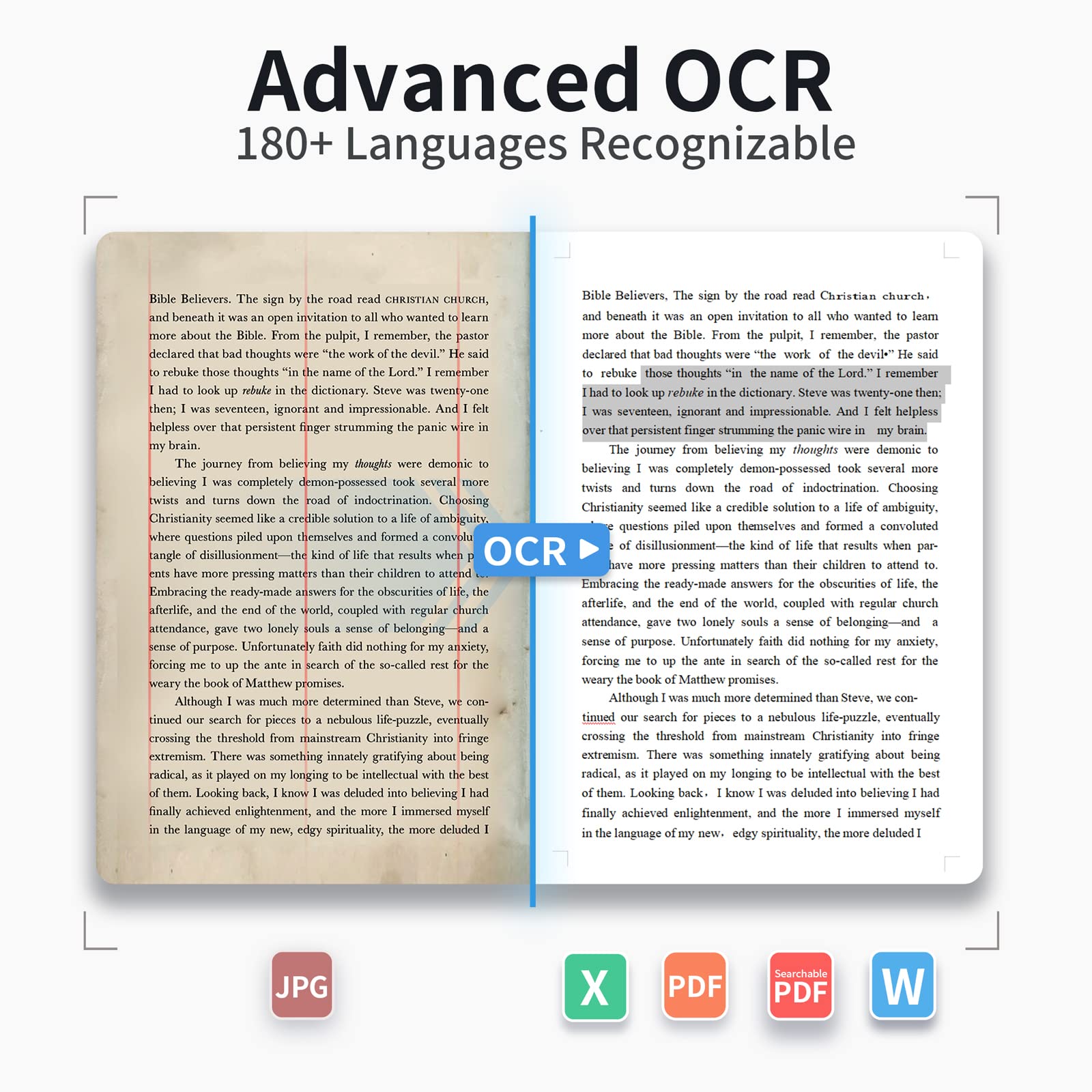 • USB Document Camera & Scanner: Work as both a document camera for remote teaching&learning compatible with ZOOM; Goole Meet; Skype and a document scanner to scan papers and convert/OCR files. Able to scan 180+ languages and convert to JPG; PDF; Searchable PDF; Word and Excel powered by ABBYY. Notice: TIFF files need to be converted from scanned JPG images