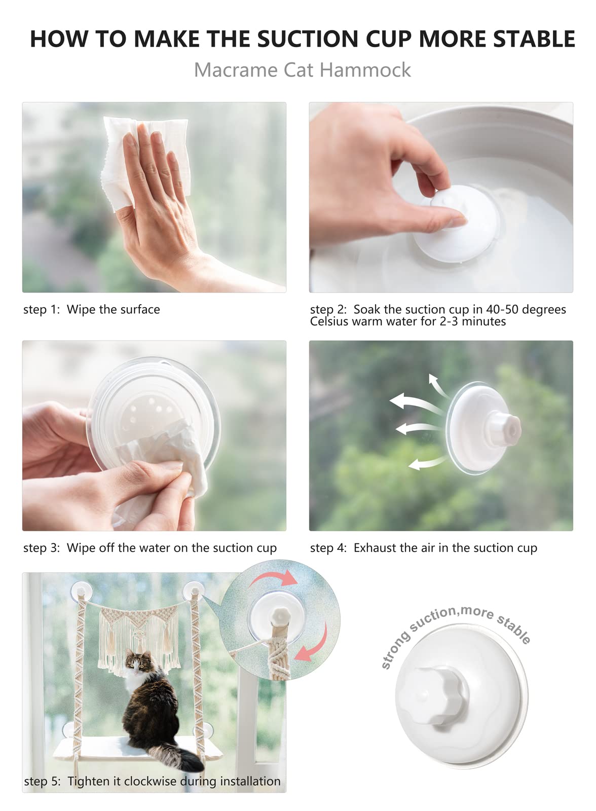 • Cat Window Hammock: Made of breathable woven fabrics, this macrame braided cat bed is suitable for summer use to help cats lose heat. In winter, add a mattress on this pet cat hammock, this cat window bed will be the best cozy cat perch. And the hard iron frame is strong enough to prevent from being bitten by the cat, but also has a stronger bearing capacity,can hold up to 45 pounds, safety and durable.