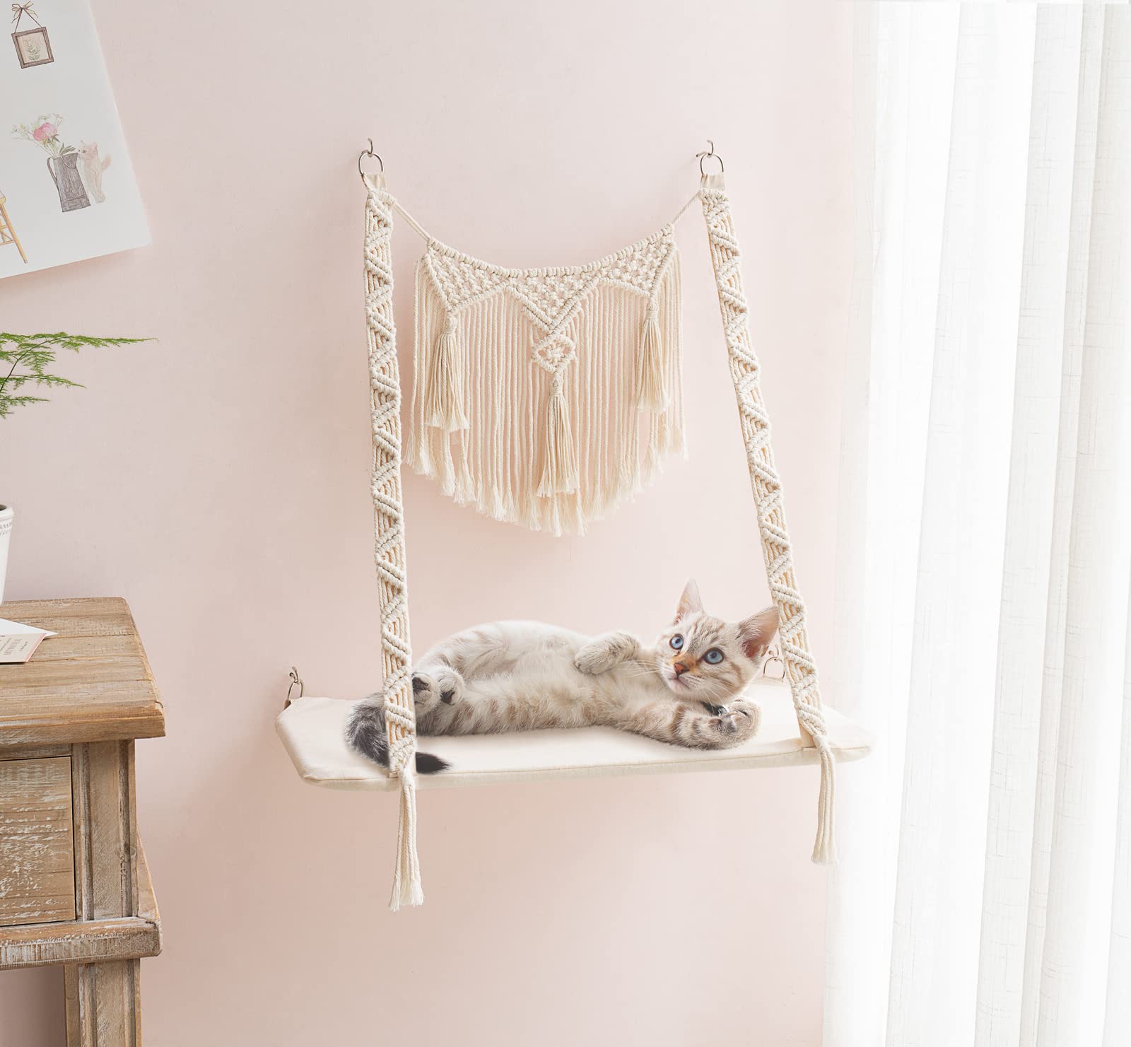 Dahey Macrame Cat Window Perch Boho Cat Hammock Wall Mounted Pet Resting Seat Bed for Indoor Cats Space Saving kitty Sunny Swing Shelf on Window Safety Holds up to 45 lbs with Screw Suction Cups, Gift