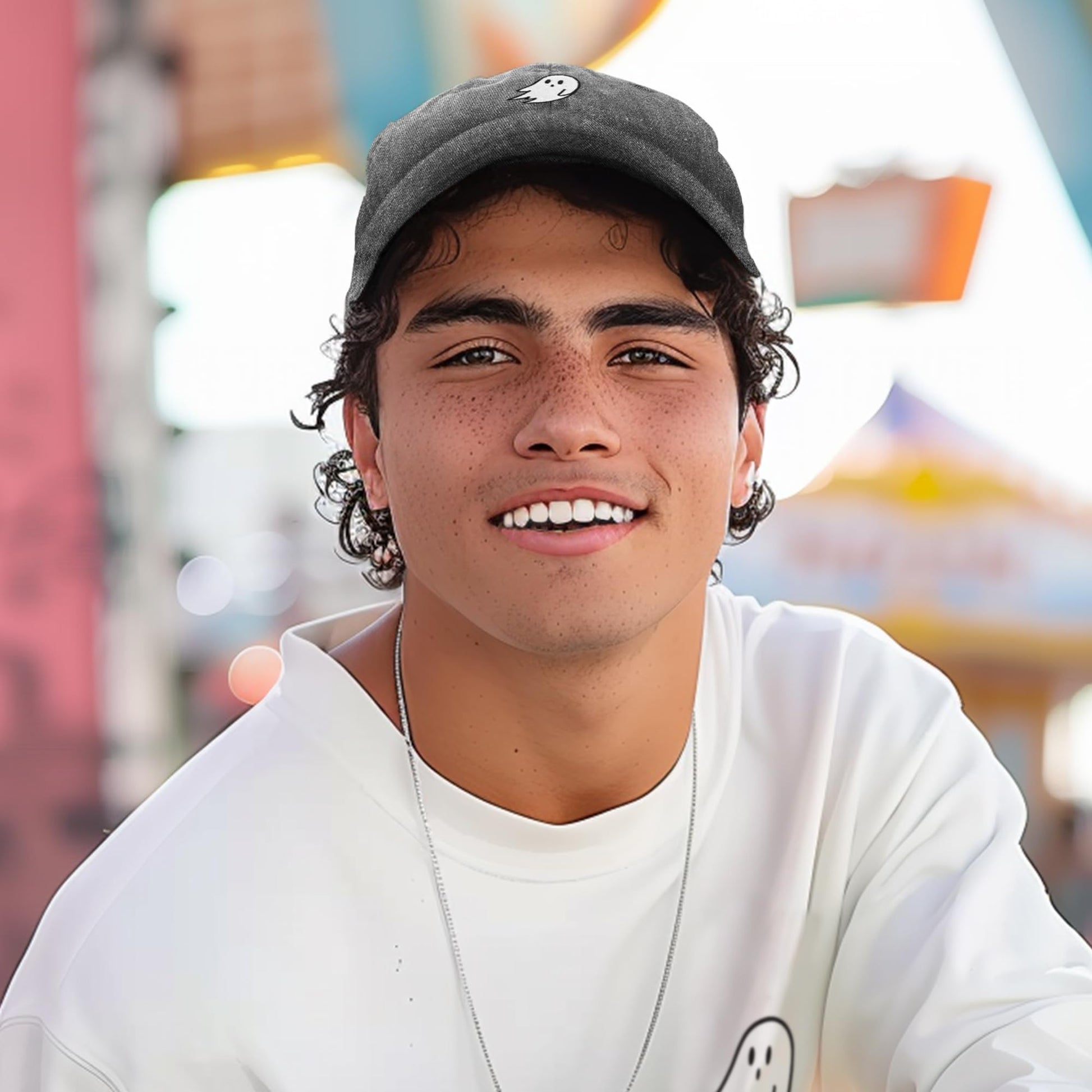 • CUSTOM DESIGNED HAT - Cute Ghost Embroidered on front panel using Premium Stitched Threading
