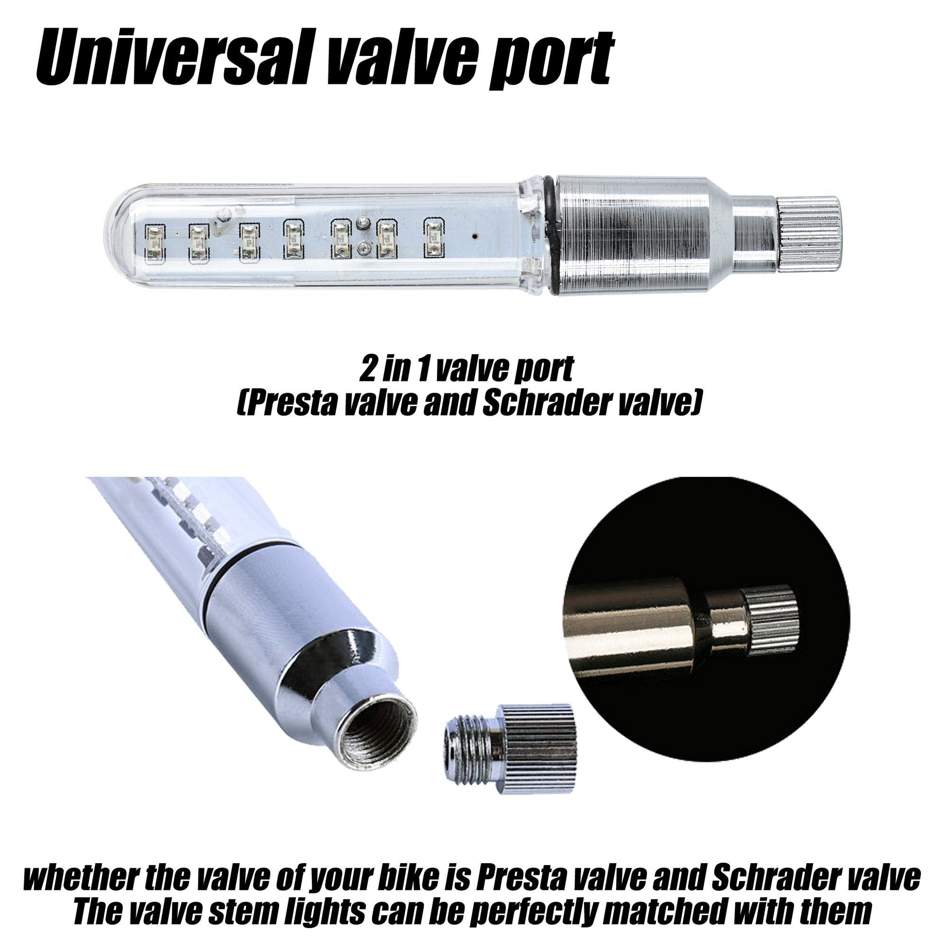 • Universal Valve Port. DAWAY A08 led bicycle wheel light uses 2 in 1 interface design, whether the valve of your bike is Presta valve or Schrader valve, whether your bike is mountain bike, road bike, kid’s bike or ordinary bike, this bike valve cap light can be perfectly matched