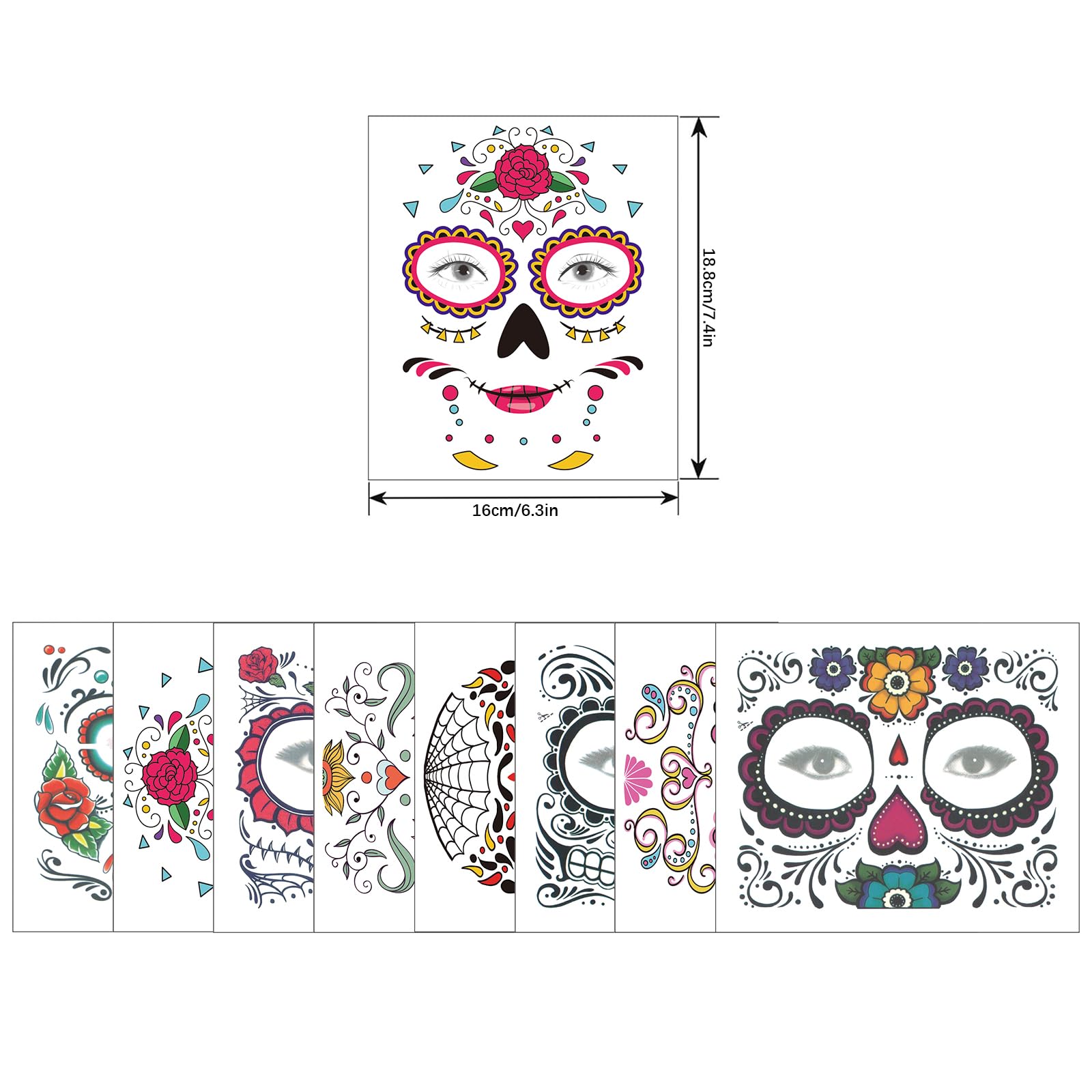 • ❥Large Face tattoos: Beautiful Day of the Dead full face temporary tattoo kit -- 8 different complete kits in size 7.4*6.3in/18.8*16cm, enjoy them with your friends, everyone shows a different personality.