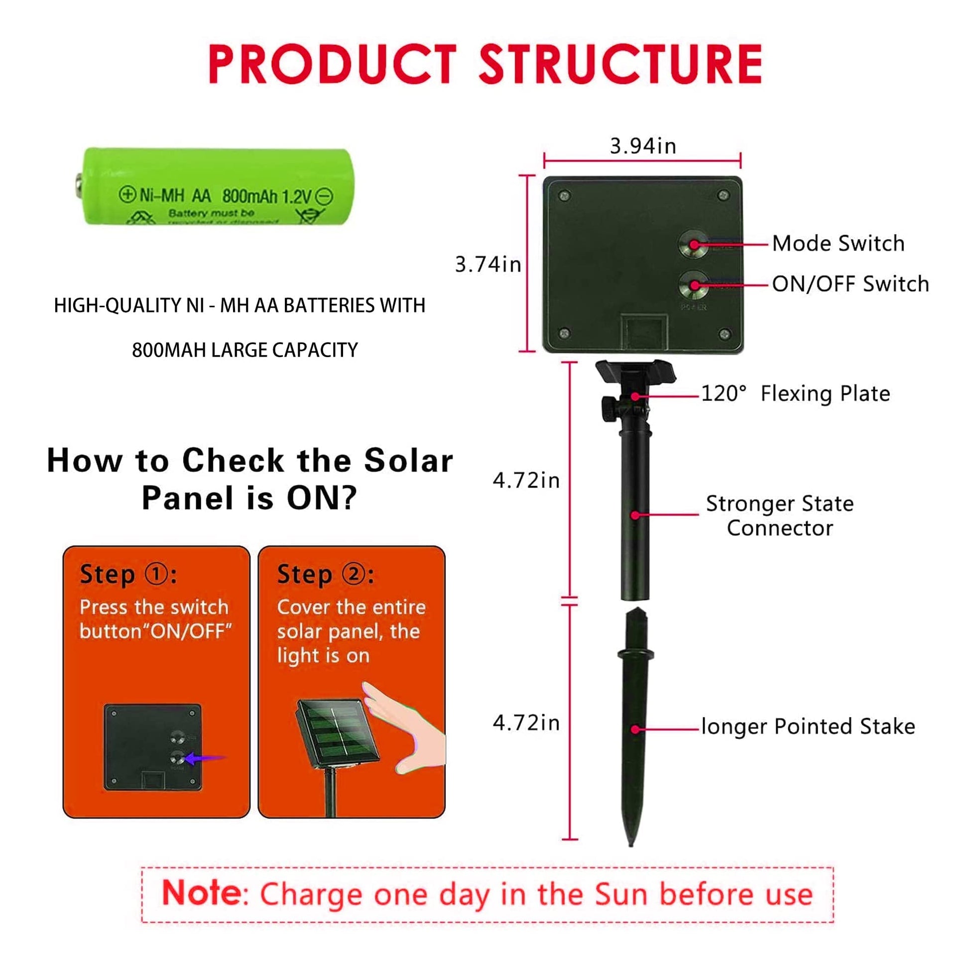 • Solar Powered Garden Lights: Powered by solar, it can work for 10 to 14 hrs after fully charged. Note: The charging efficiency depends on the weather. Each solar panel is equipped with Ni-MH AA 800m AH battery, which has large capacity for whole night lighting require. Please turn on switch before charging and the string light will automatic illuminate at dark and off at dawn.