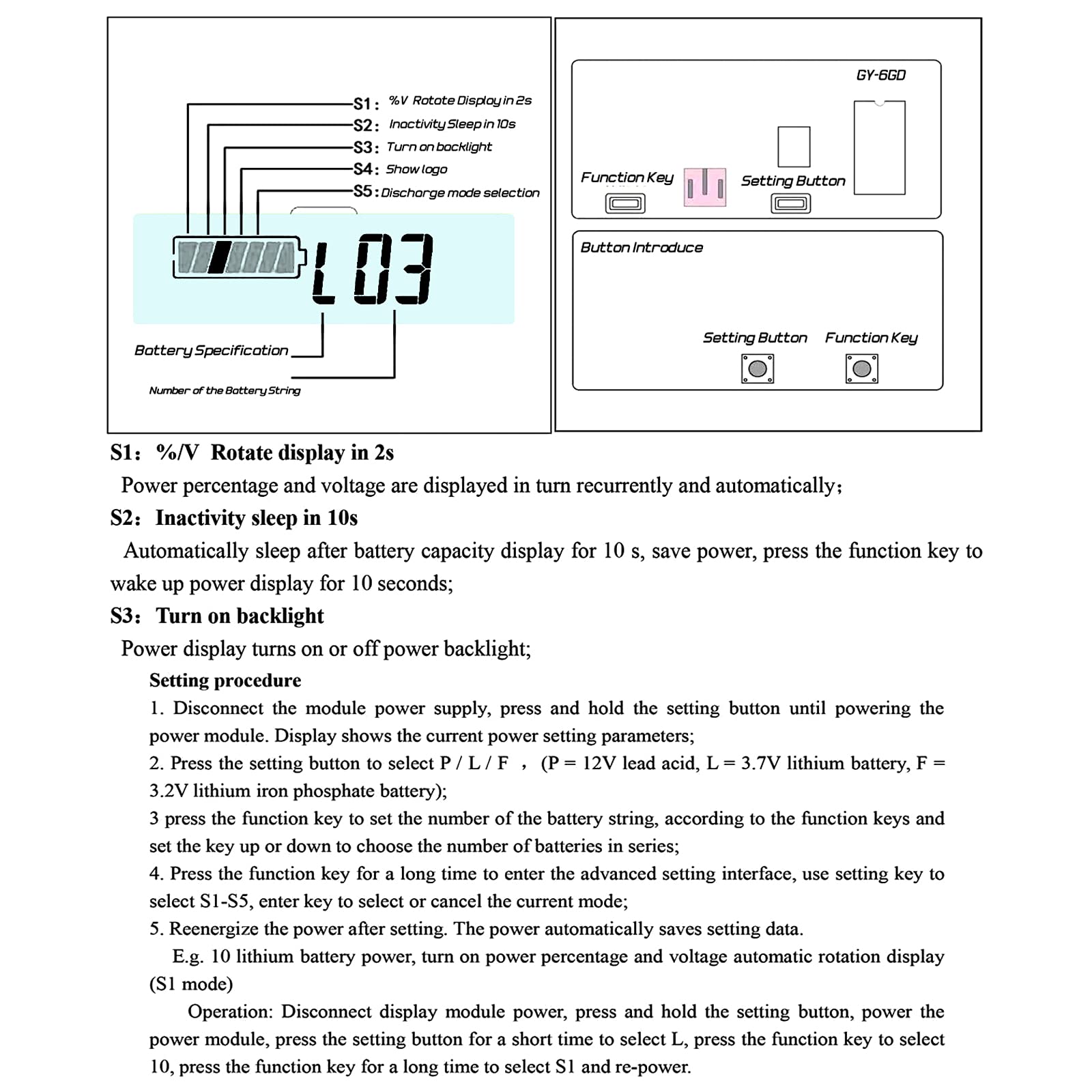 • Efficient setting key: the package includes 1 battery meter; the multifunctional battery indicator has a new design of the front setting button, and have several functions: cycle voltmeter/battery percentage, turn on the backlight, black, sleep mode, battery type selection etc.