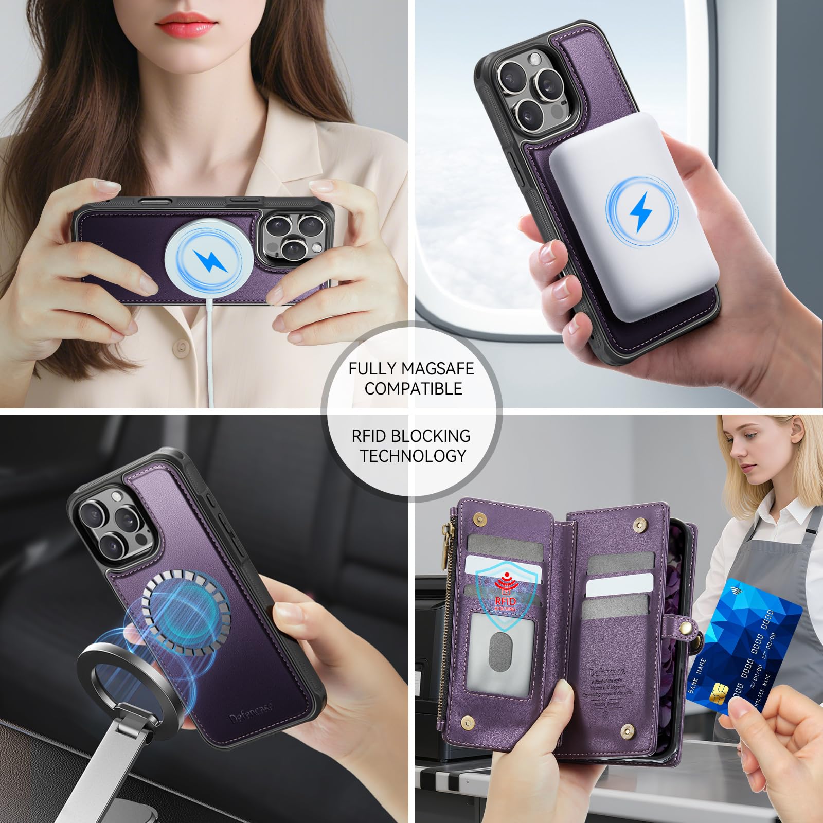 Defencase for iPhone 16 Pro Max Magnetic Wallet Case Compatible with Magsafe with RFID Blocking Zipper Strap Card Holder for Women Men PU Leather Detachable Case for iPhone 16 Pro Max (6.9"), Purple