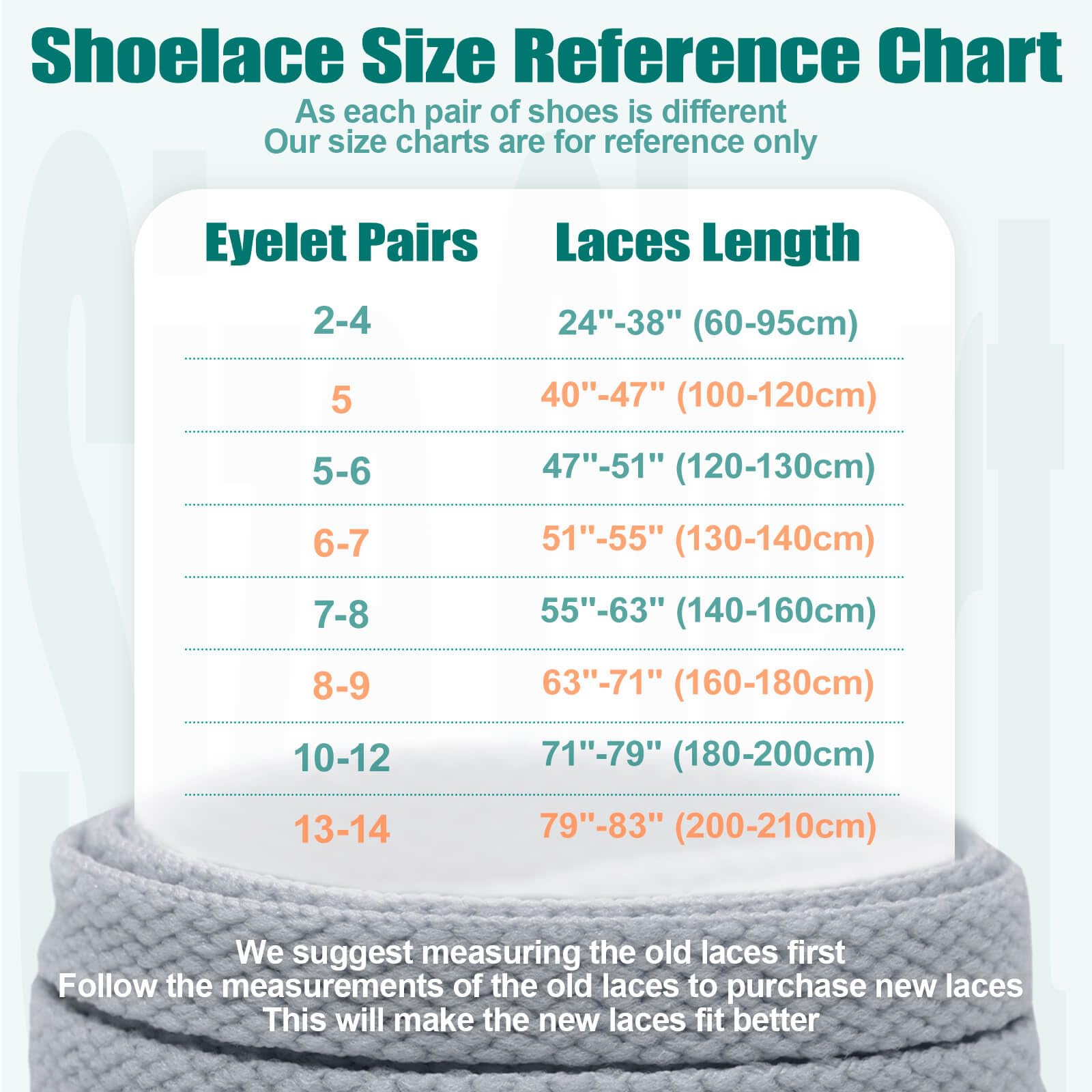 • [Steps to Use] Take off the shoelace that is now on it and measure the length from tip to tip. This is the required length. If your previous laces are too short or too long, add or subtract from your laces. Attention: the length of 60 cm - 95 cm is more suitable for shoes with less than 4 holes; For shoelaces over 100 cm in length, we recommend shoes with 5 or more holes