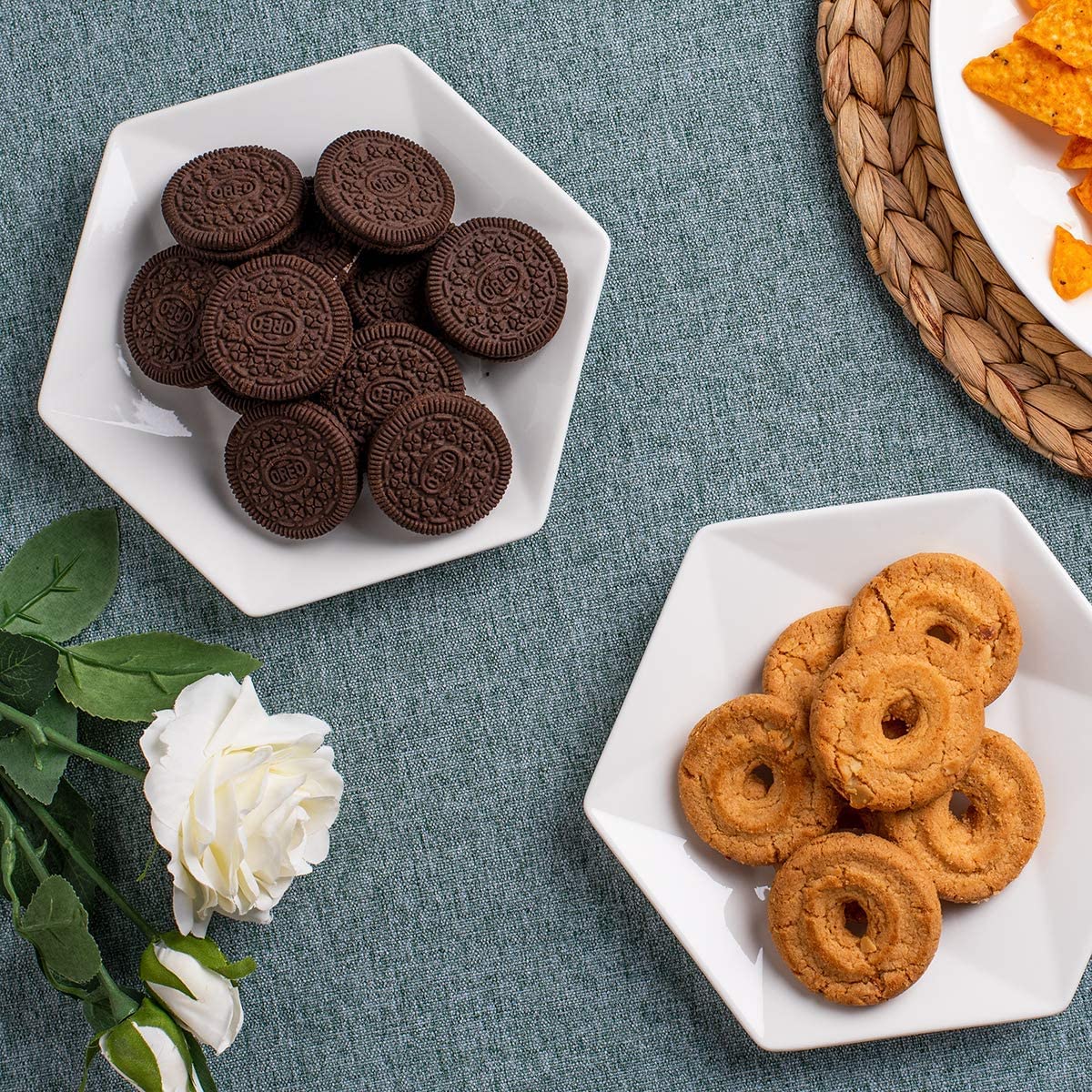 • Modern Aesthetic Design: A nice benefit to the Delling appetizer plates over more conventional square or circular dessert Plates is the geometric design, these snack plates feel silky smooth to the touch, the angular is beautiful and shiny,more modern yet well made. These charming white plates adds a touch of interest to any food served.
