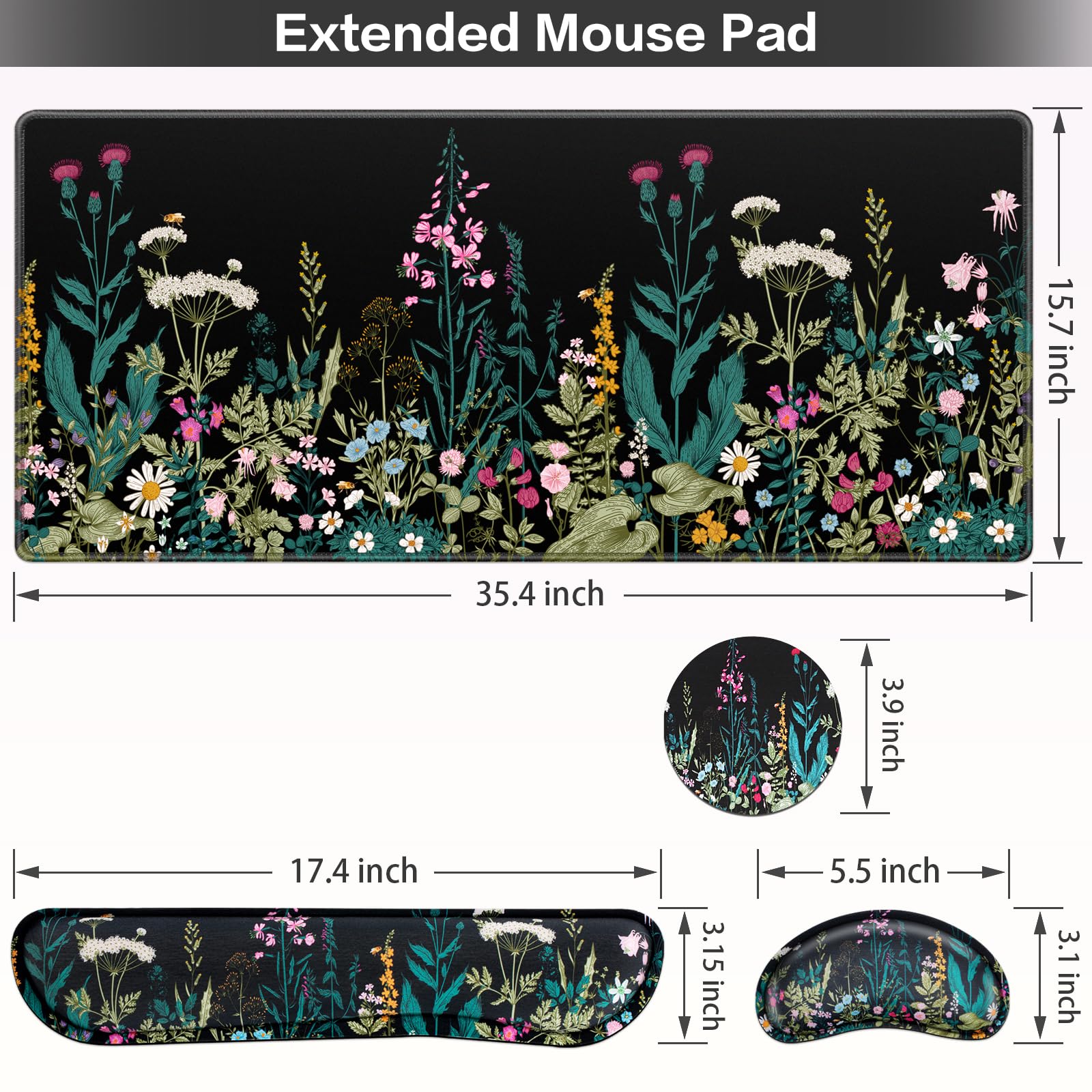 Desk Mat, Large Gaming Mouse Pad with Wrist Rest, 4in1 XXL Mousepad+Keyboard Wrist Rest+Mouse Pad Wrist Support+Cup Coaster Set Ergonomic Floral Computer Desk Arm Wrist for Decor Home Office Women