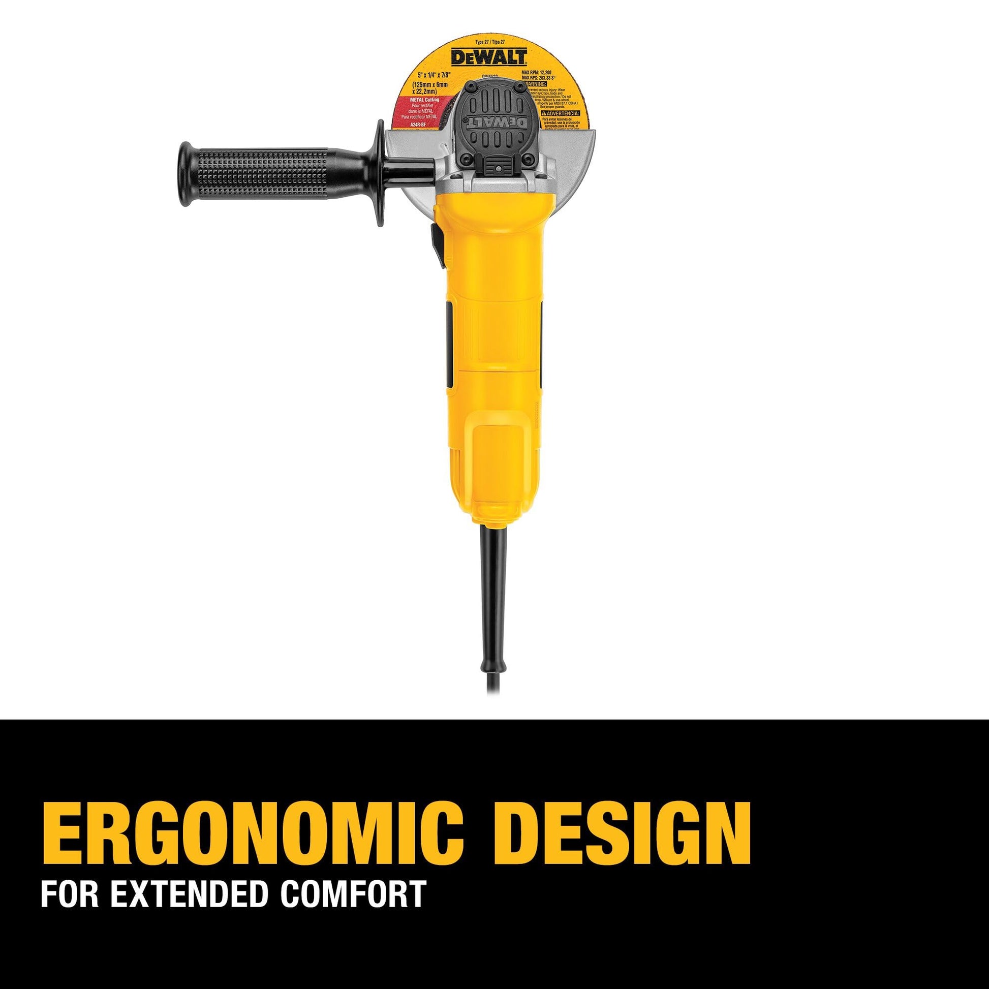 Details: The DWE4011 4-1/2-inch Small Angle Hand Grinder with One-Touch Guard has a powerful 7-amp motor for fast material removal. One-Touch Guard of the grinder tool eliminates the need for a tool to adjust the guard location.