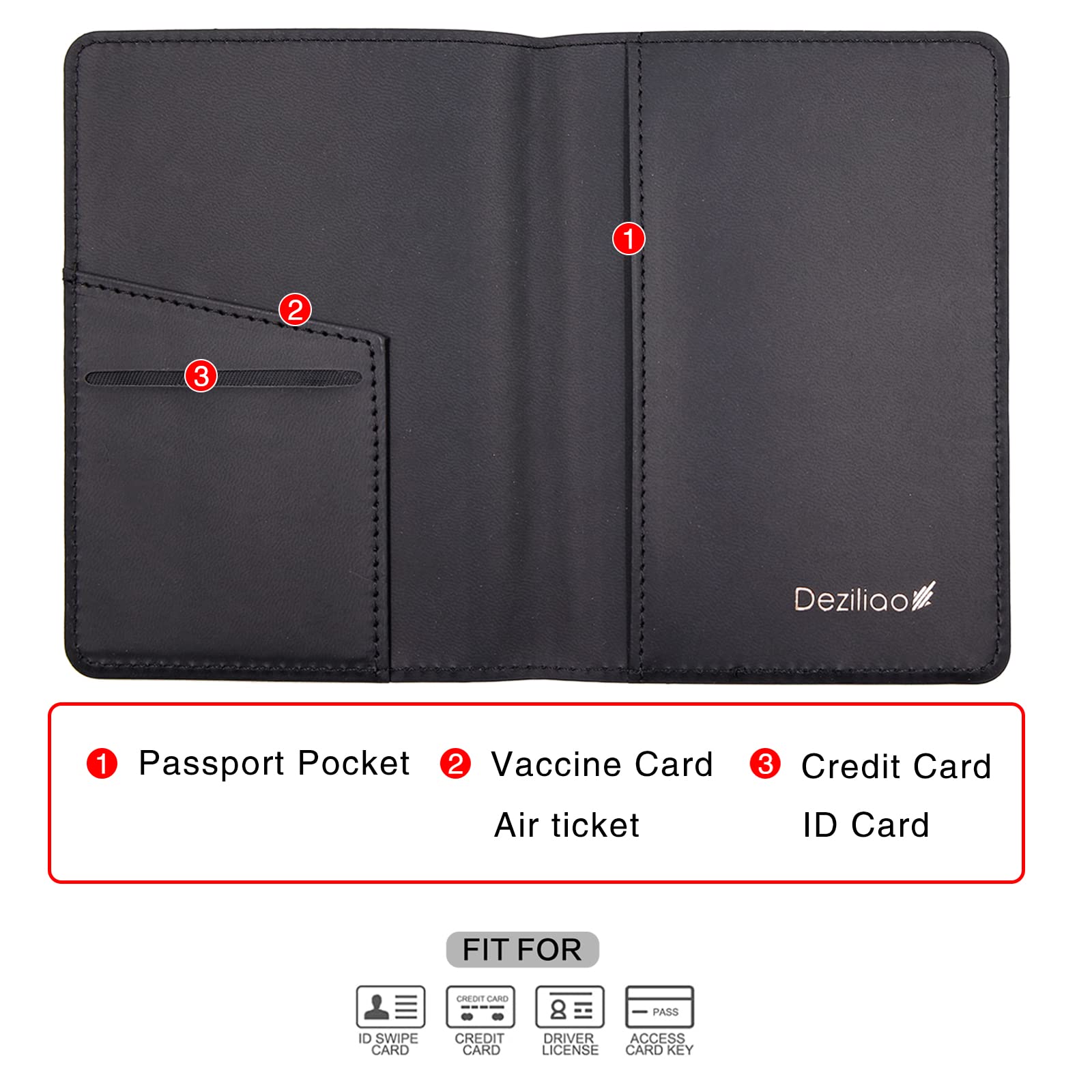 • Passport Cover with Vaccine Card Holder: Deziliao passport holder has 2 clear plastic slots that fit a 4 x 3 inch CDC vaccination card and another clear plastic slot for important documents such as driver's license, ID card, or even a family photo. You can display these documents directly without having to remove them from the passport case and avoid the risk of damage.