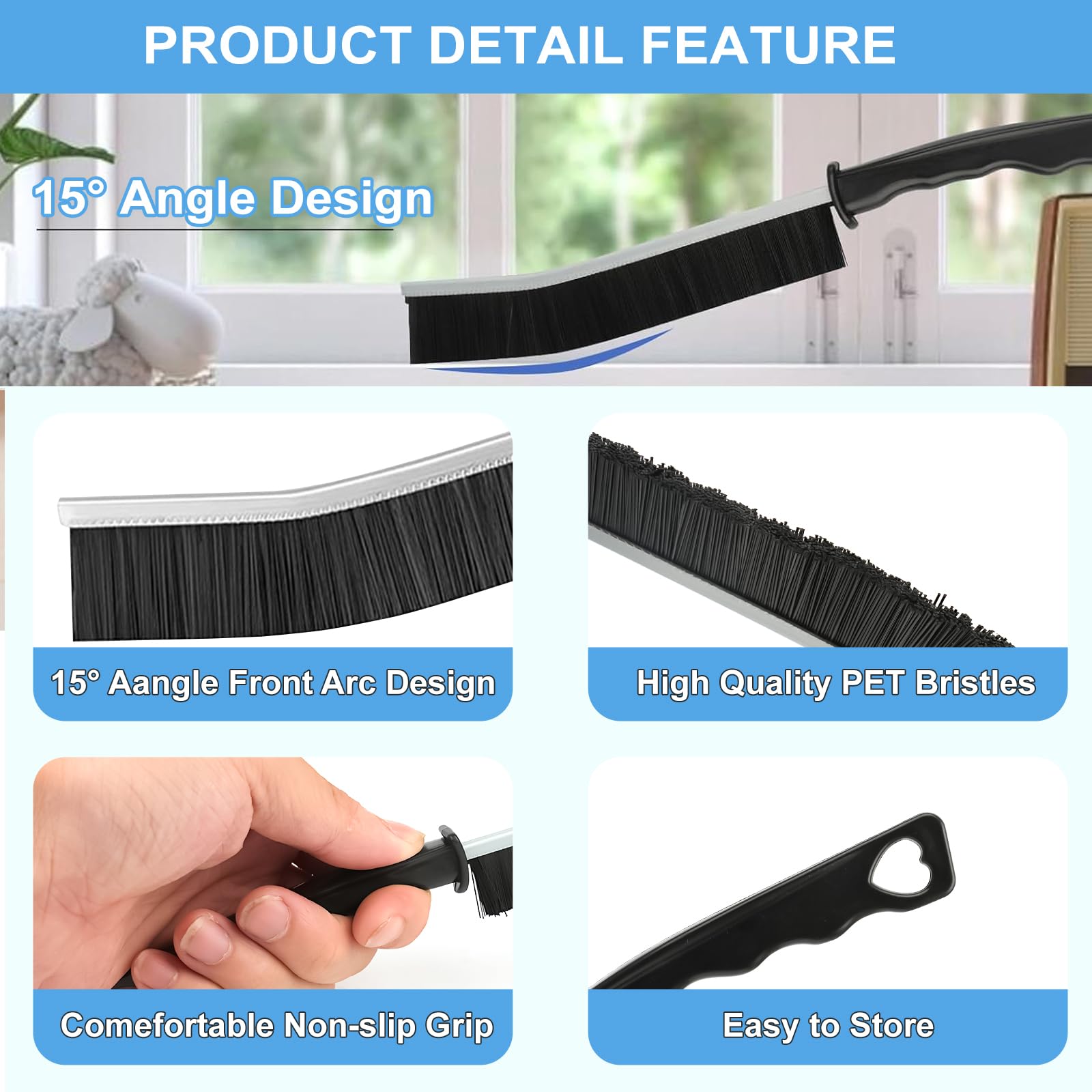 • 【Ergonomic Design】 The handles of the brush and scraper are ergonomically designed, providing a comfortable grip when used. The angle design of the bristles and scraper makes cleaning more convenient, efficient and labor-saving. All tools have hanging spaces at the tail for easy storage.
