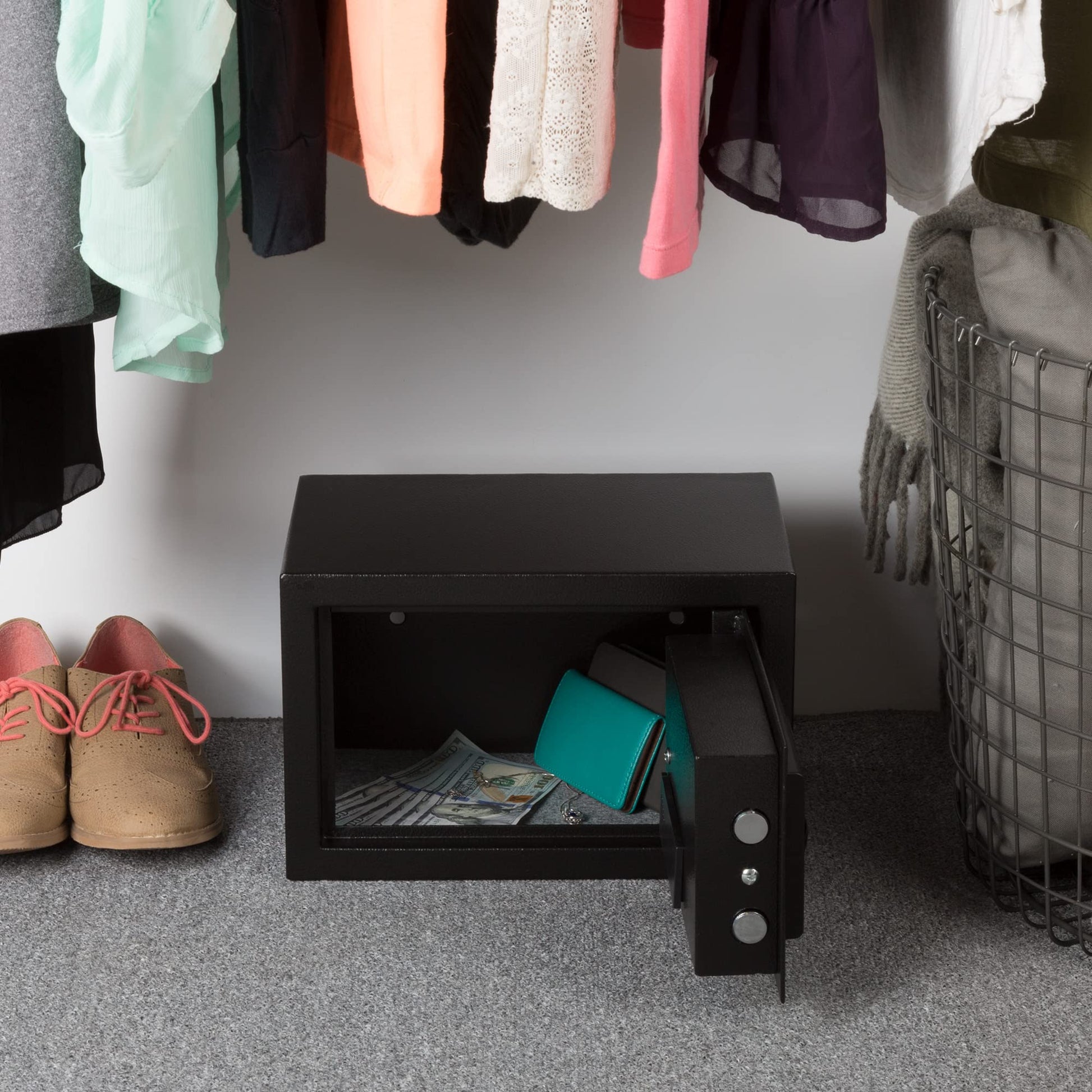 PORTABLE SAFE BOX - This digital cash box can conveniently be utilized in your home, office, or business and is portable for use while traveling. It can be mounted on your wall or floor if you wish to keep it in one place, making it an ideal hidden safe.
